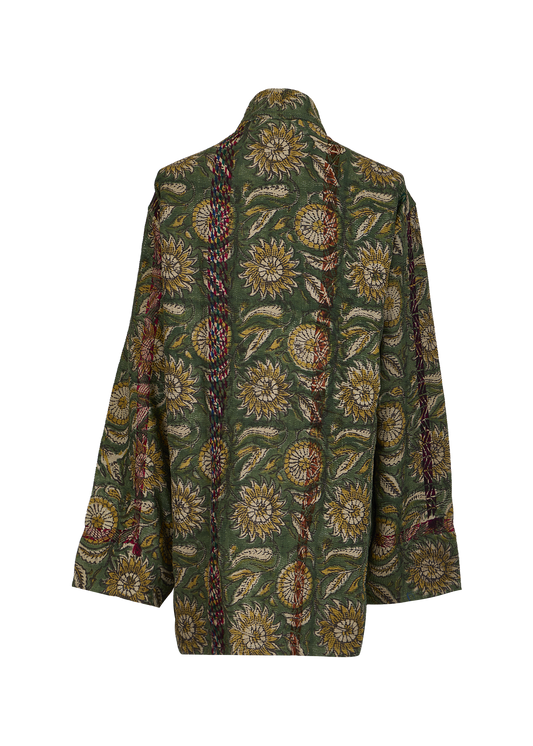 These jackets are made of a traditional and eco-friendly hand-block printed textile that originates from the village of Bagru in Rajasthan. The process involves the use of carved wooden blocks with natural inks and dyes to stamp repetitive patterns onto the the old Kantha quilts. In some cases also, mud printing technique is used in order to keep the specific pattern uncolored when the whole fabric is dyed.