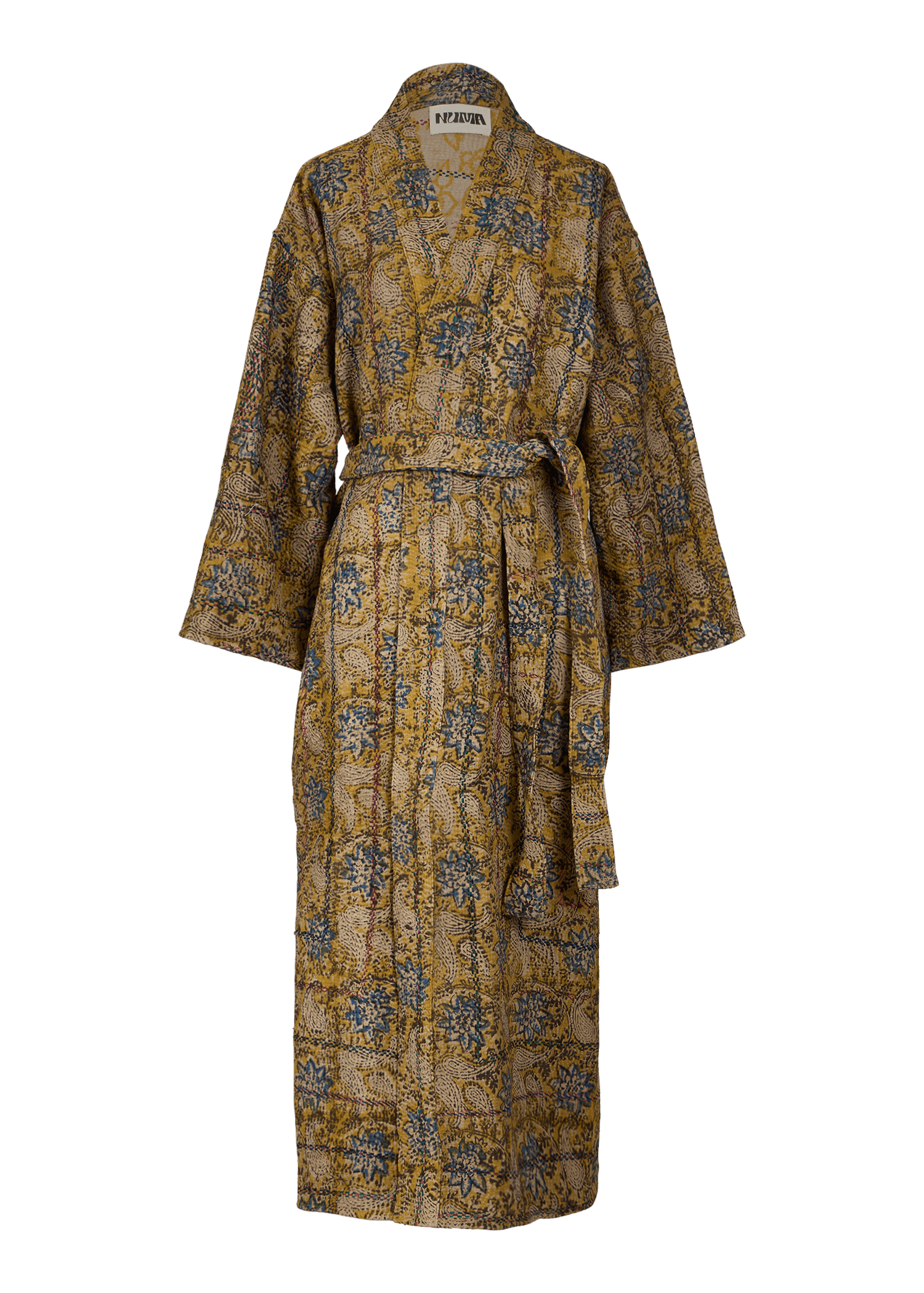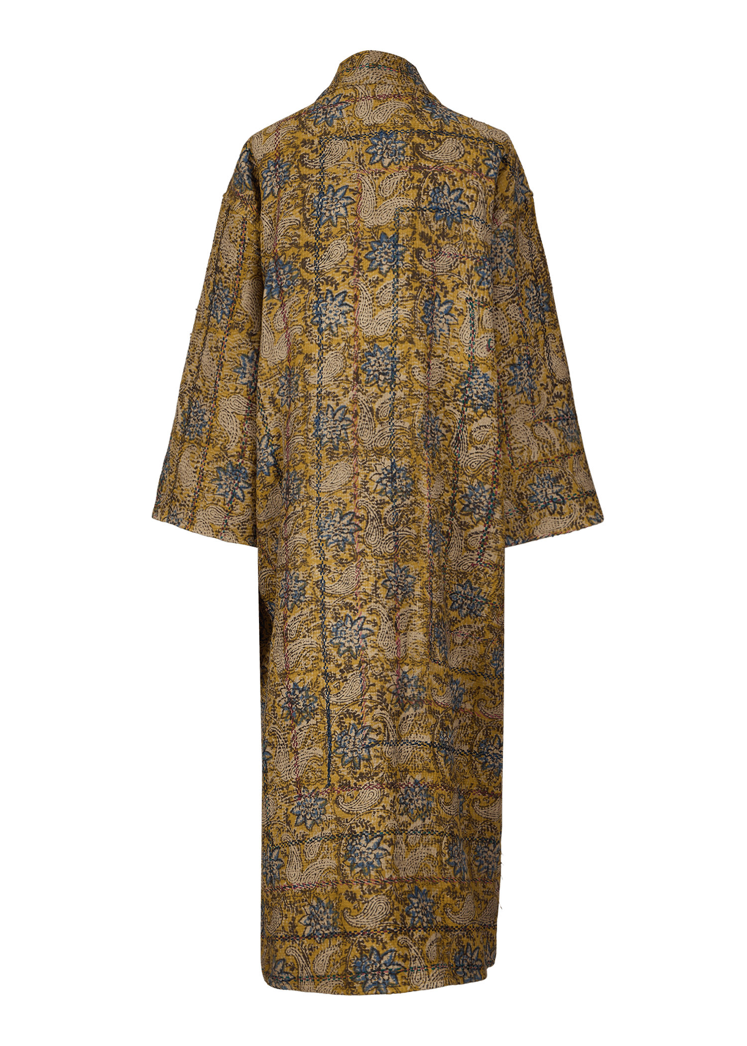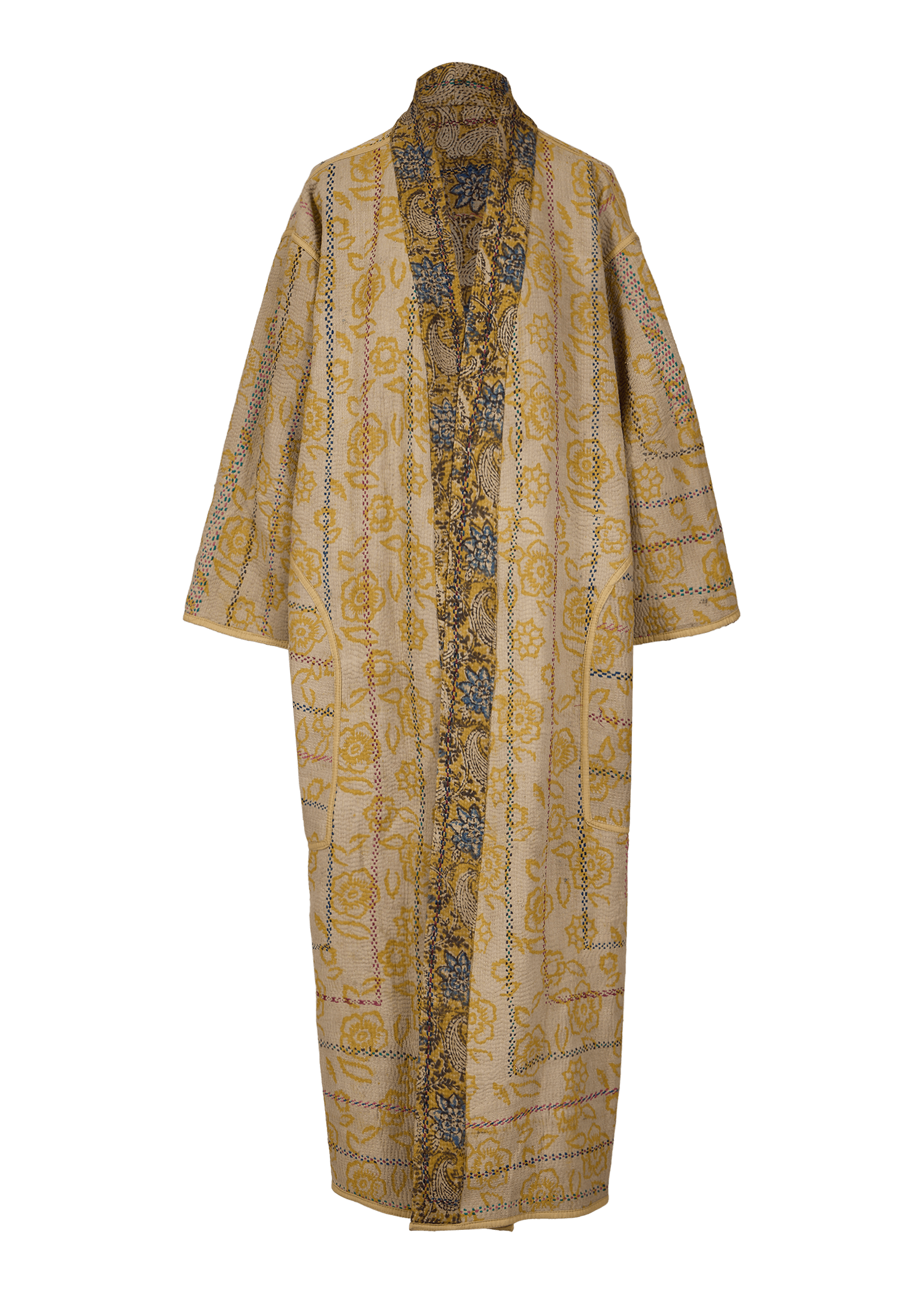 This oversized reversible coat features a relaxed, open-front design with an optional belt to accentuate the silhouette. Crafted with bold patterns from hand-block printed Kantha quilts, it offers two unique looks in one. Its length falls at the calf and its unisex fit makes it a versatile statement piece.