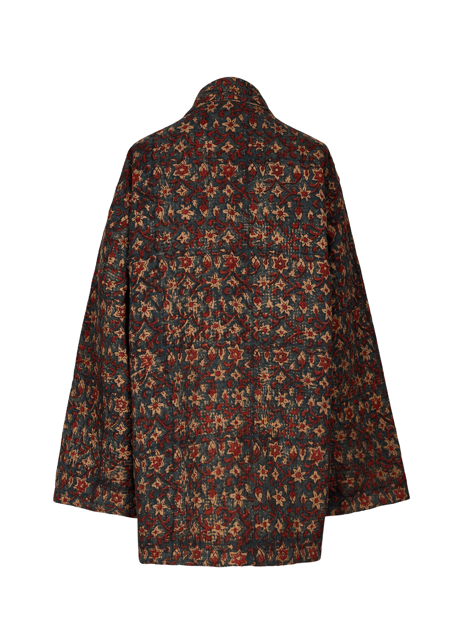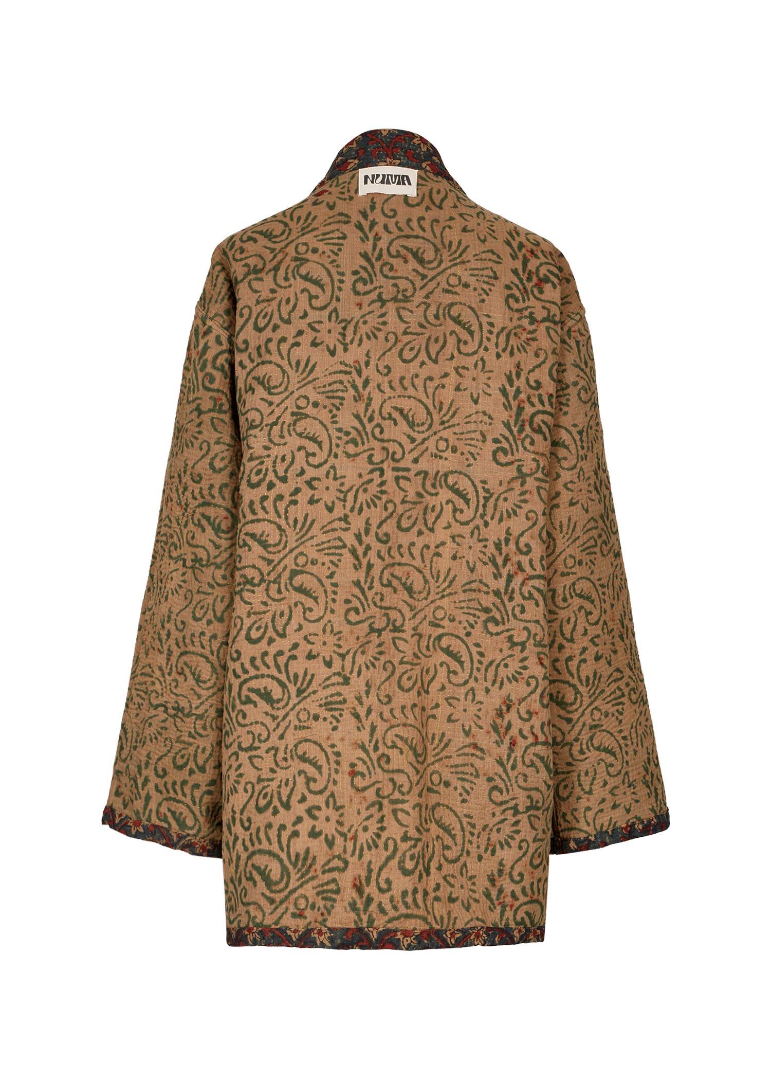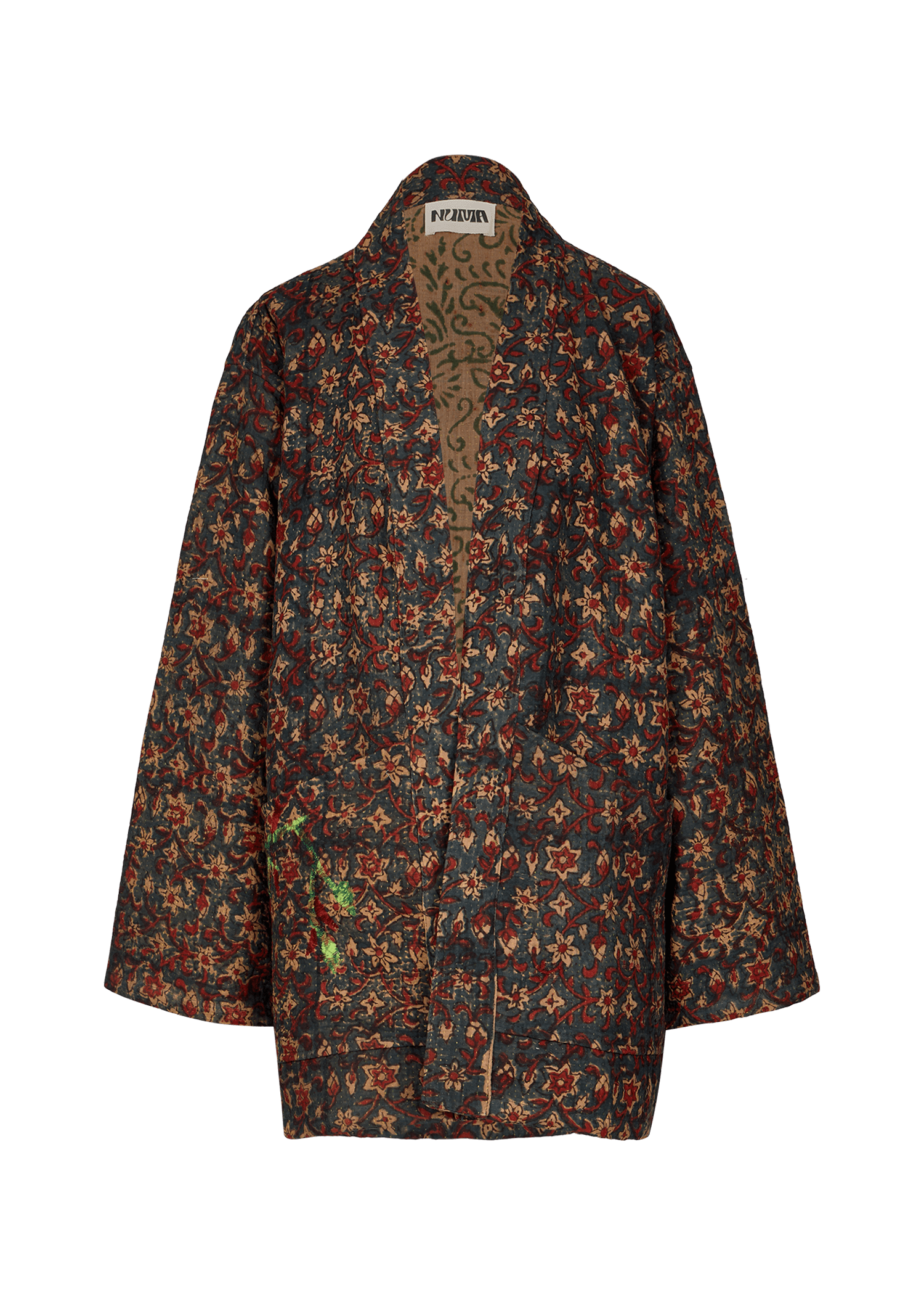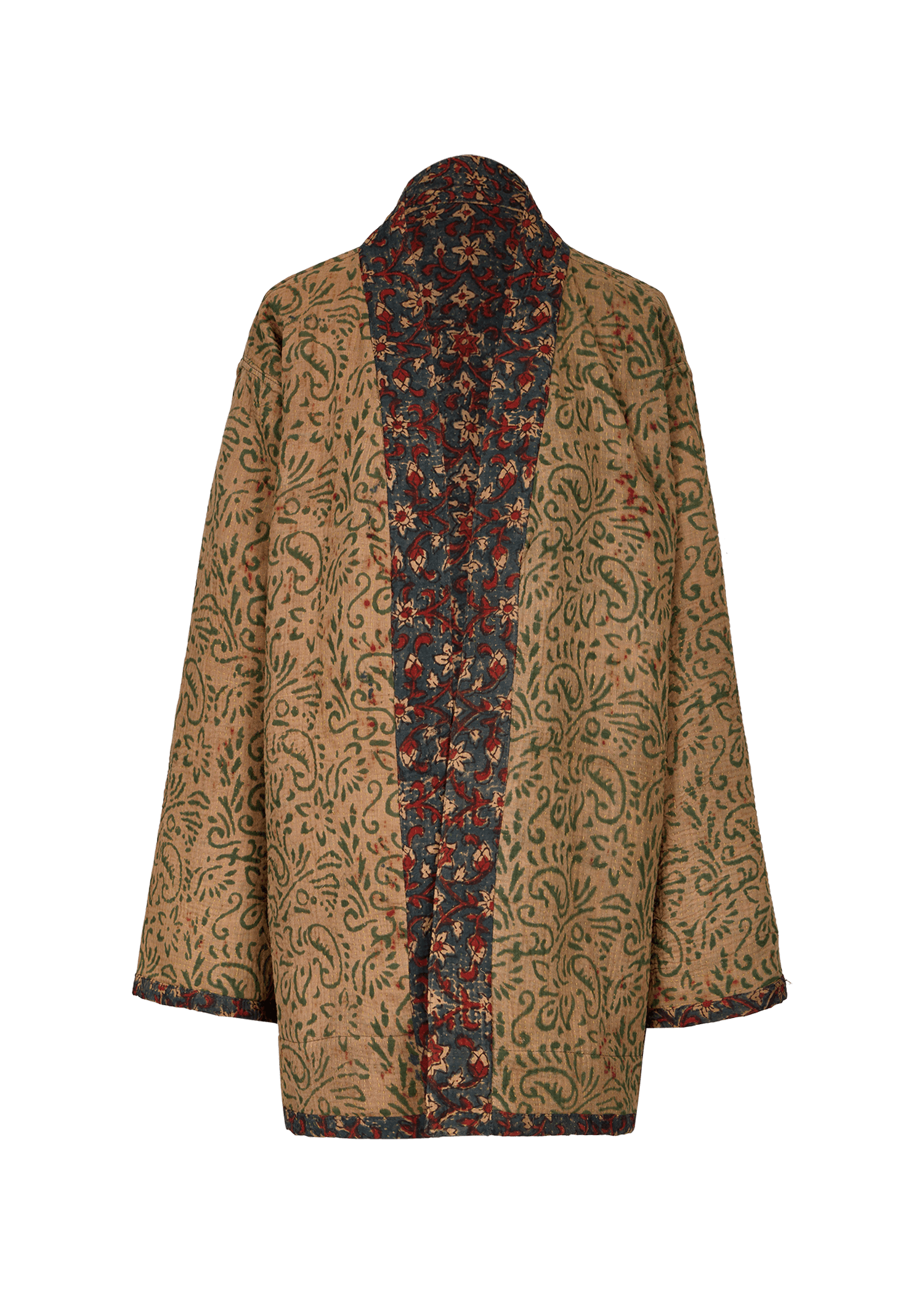 These jackets are made of a traditional and eco-friendly hand-block printed textile that originates from the village of Bagru in Rajasthan. The process involves the use of carved wooden blocks with natural inks and dyes to stamp repetitive patterns onto the the old Kantha quilts. In some cases also, mud printing technique is used in order to keep the specific pattern uncolored when the whole fabric is dyed.
