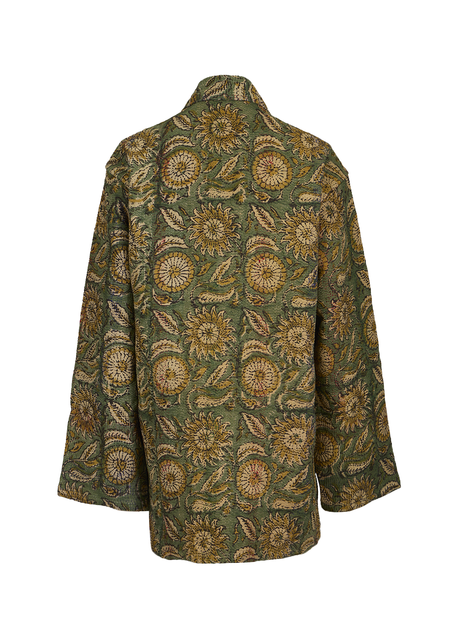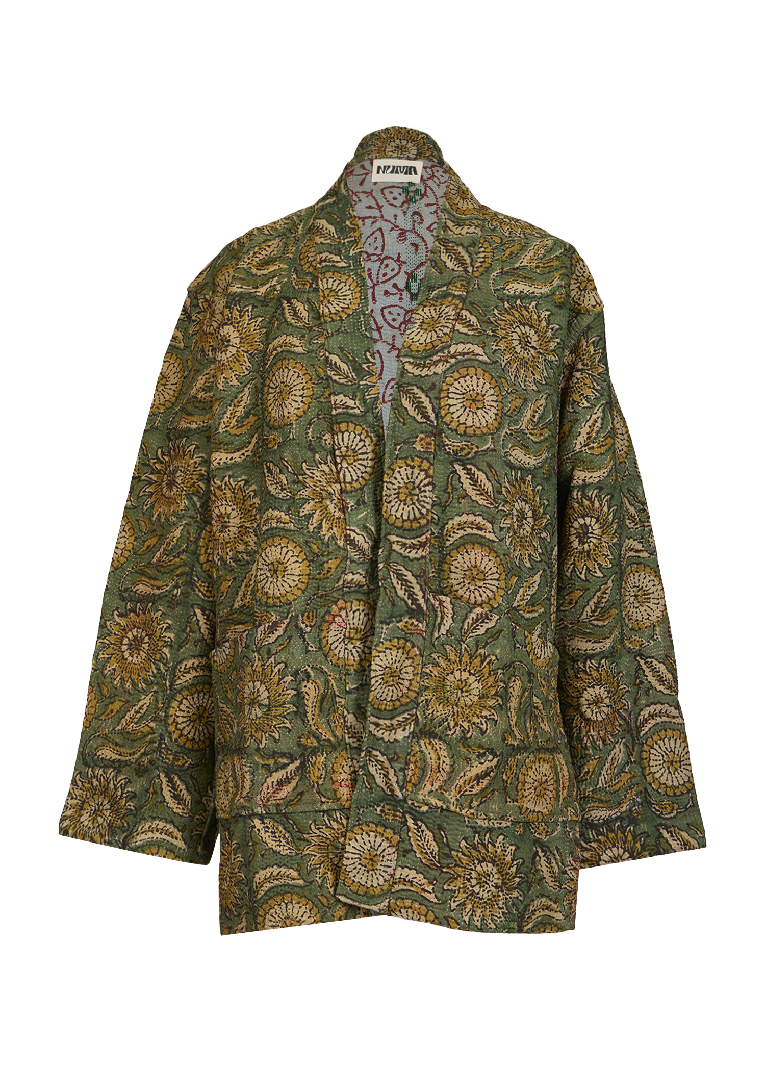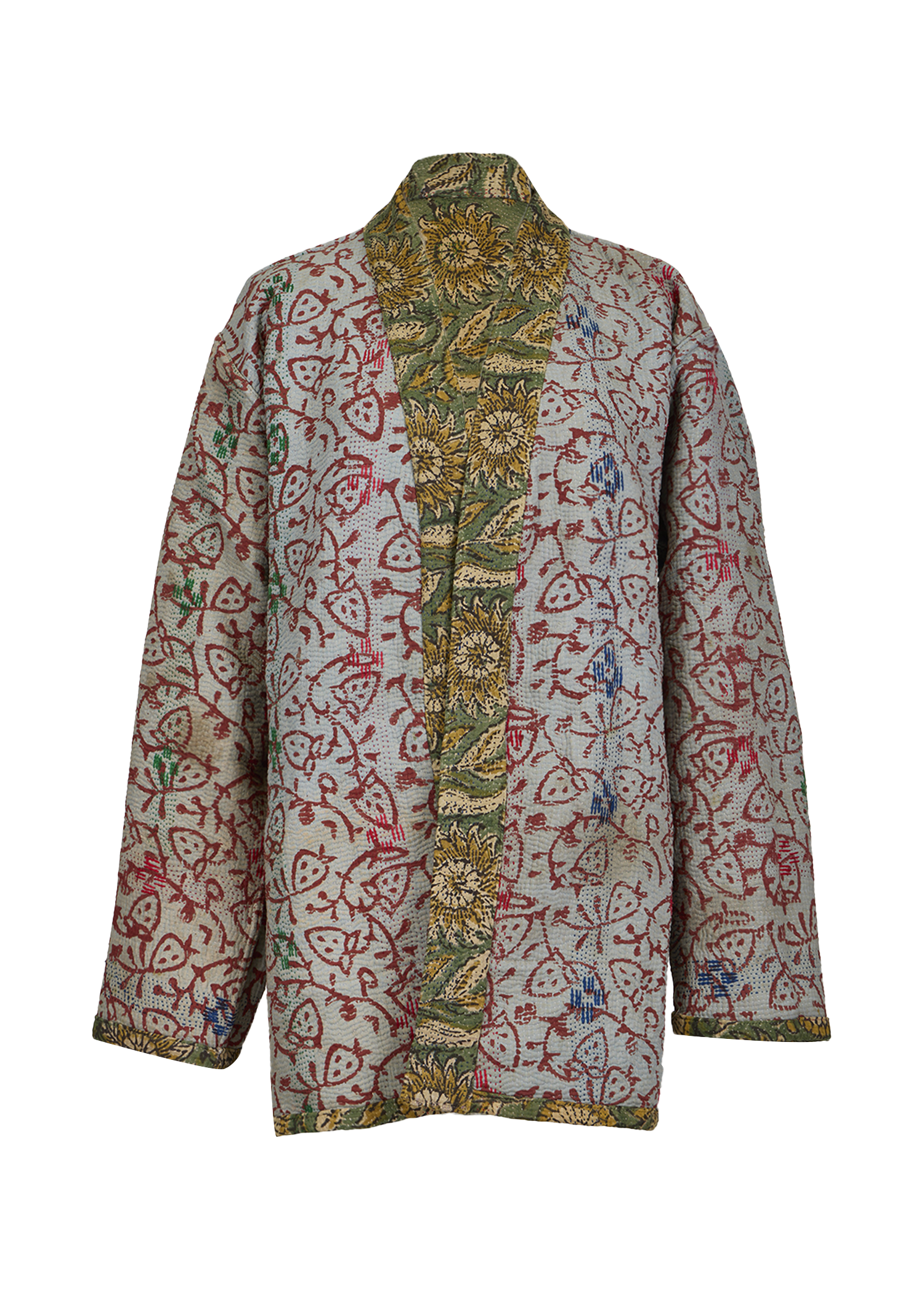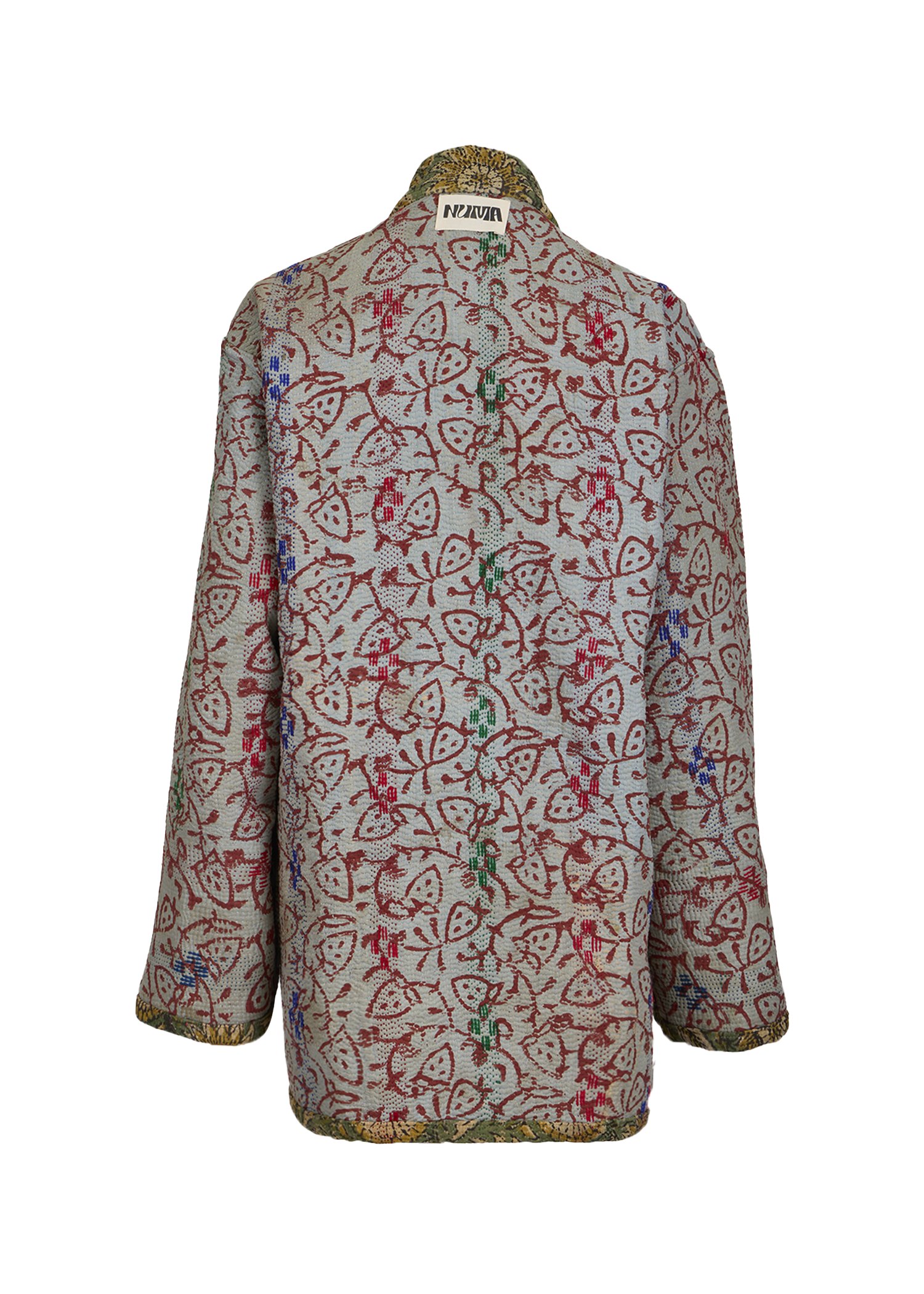These jackets are made of a traditional and eco-friendly hand-block printed textile that originates from the village of Bagru in Rajasthan. The process involves the use of carved wooden blocks with natural inks and dyes to stamp repetitive patterns onto the the old Kantha quilts. In some cases also, mud printing technique is used in order to keep the specific pattern uncolored when the whole fabric is dyed.