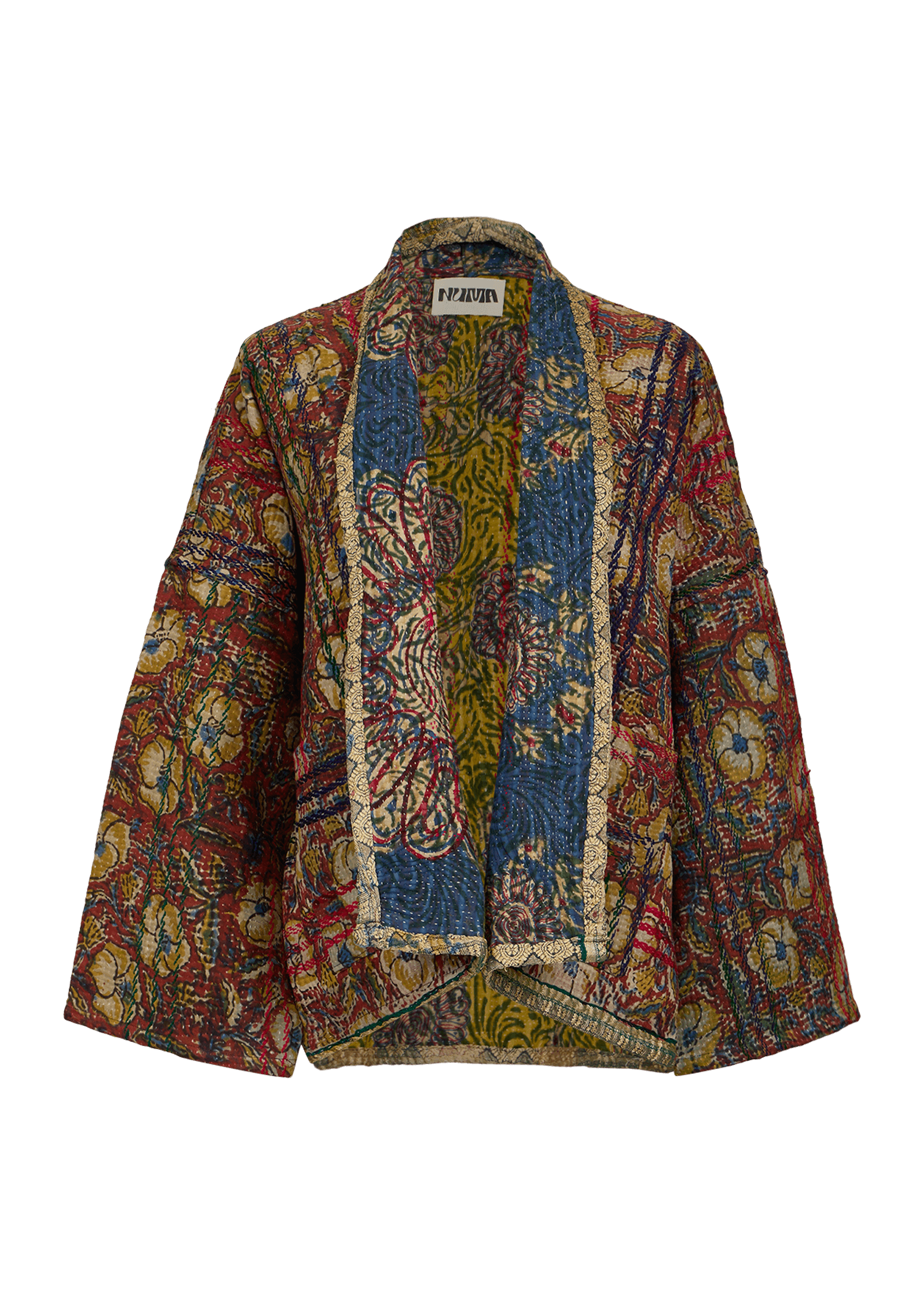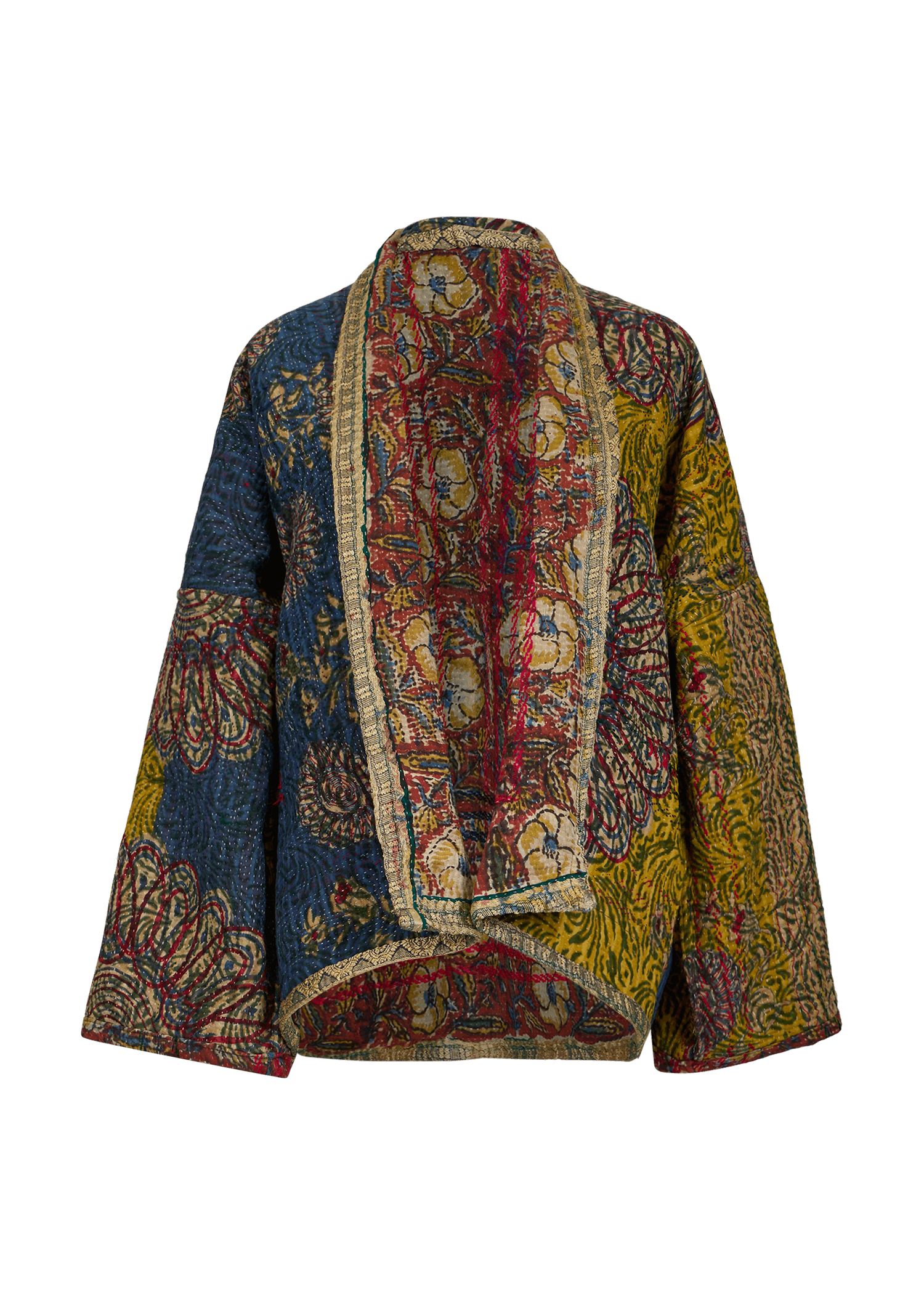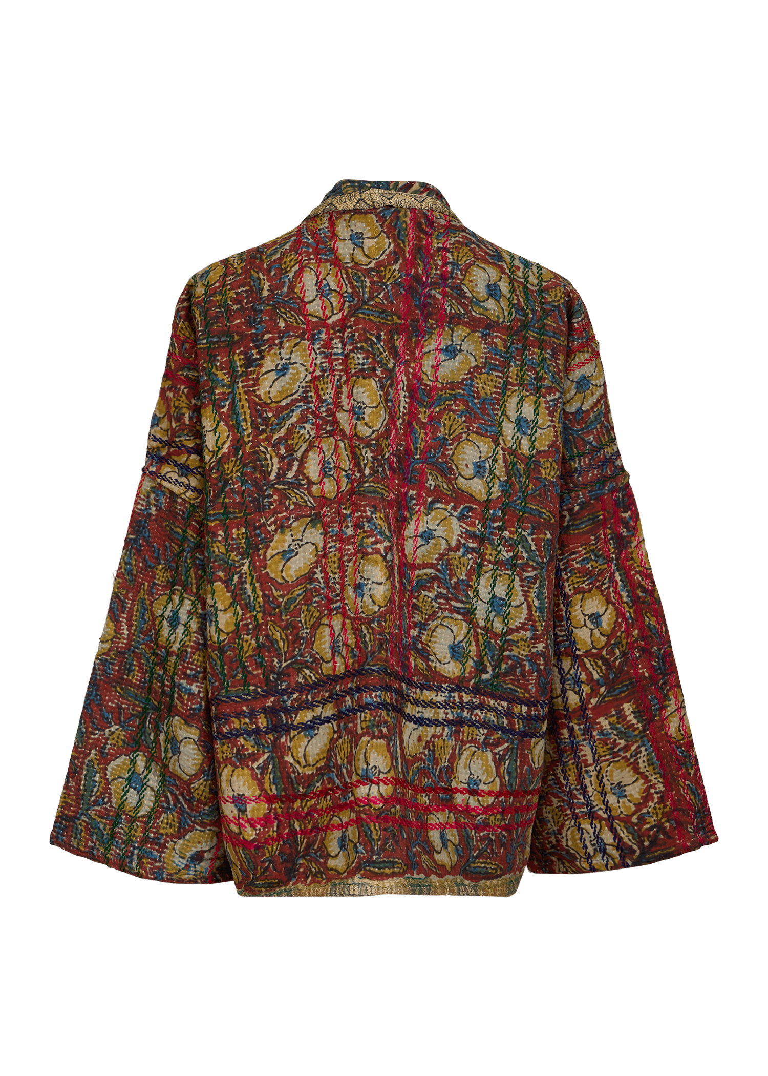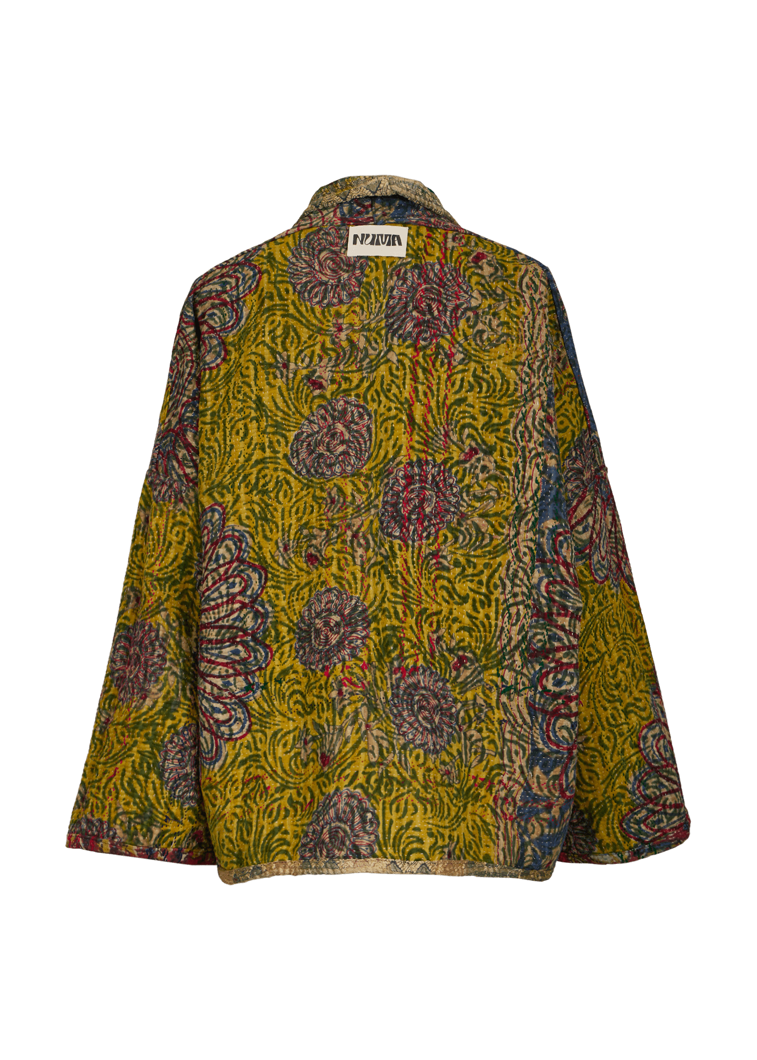 These jackets are made of a traditional and eco-friendly hand-block printed textile that originates from the village of Bagru in Rajasthan. The process involves the use of carved wooden blocks with natural inks and dyes to stamp repetitive patterns onto the the old Kantha quilts.