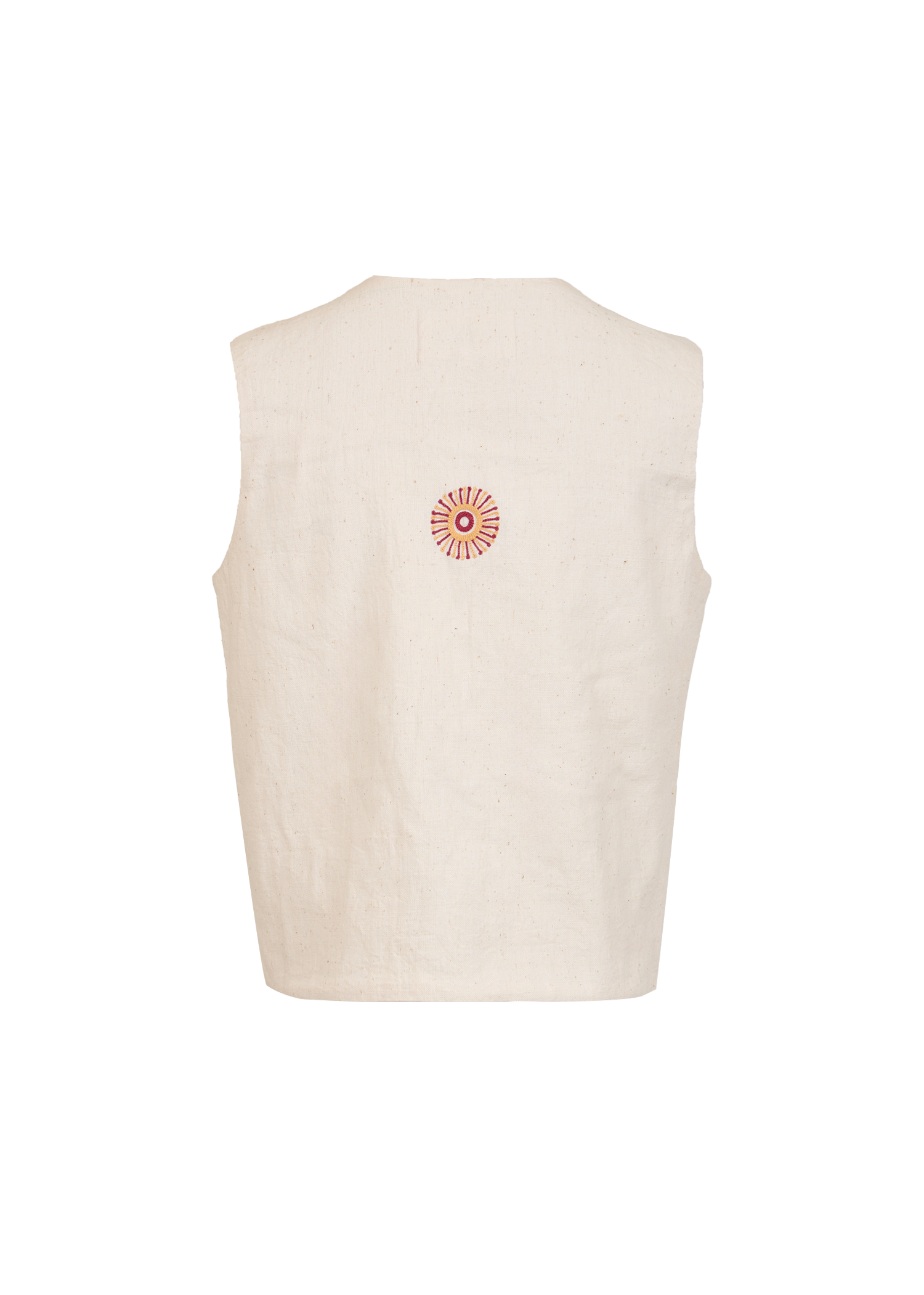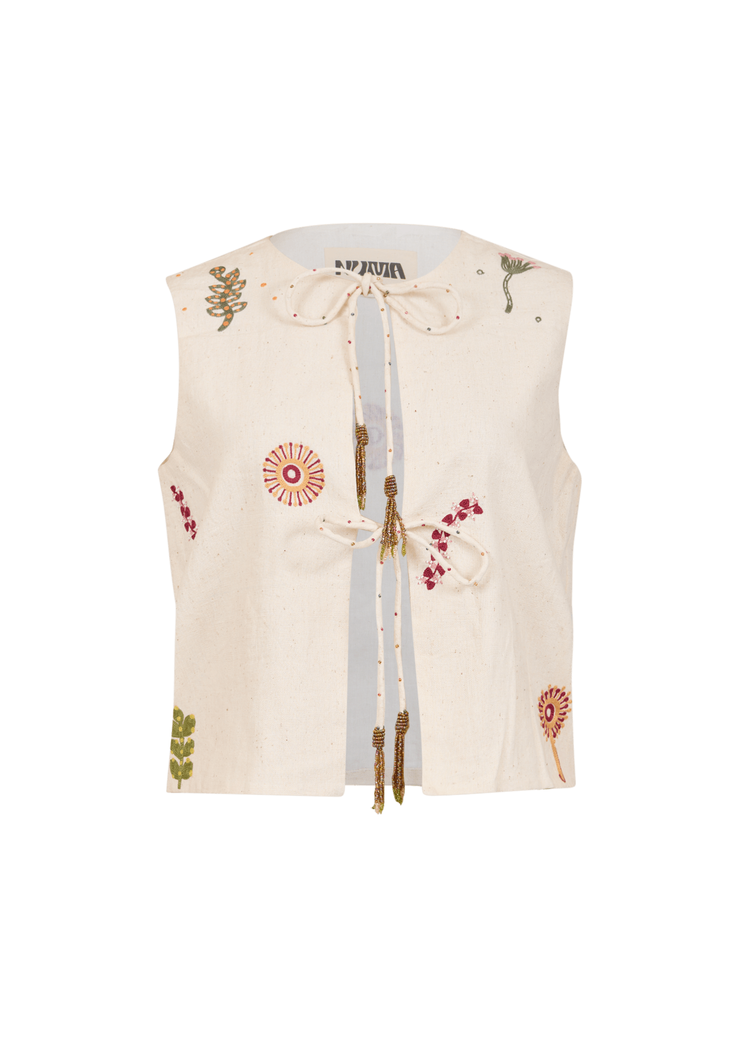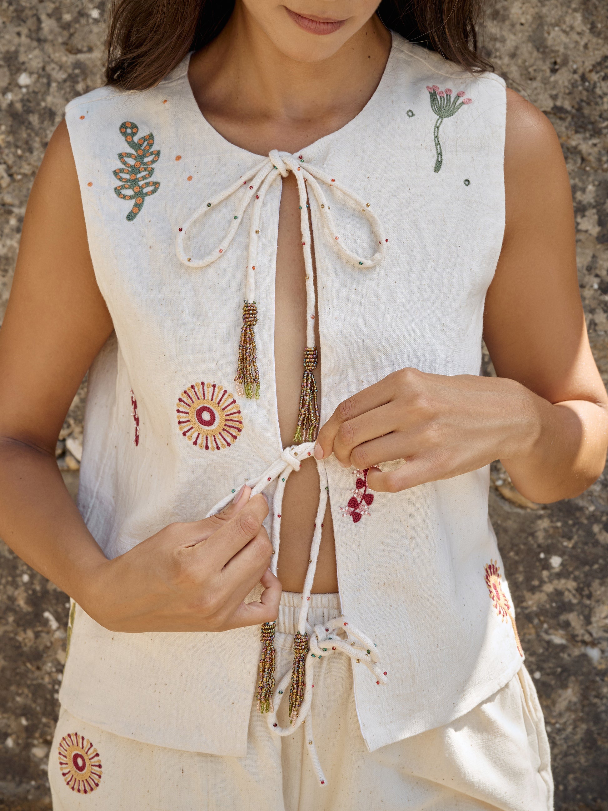This sleeveless Kala cotton tie-up top is adorned with delicate Aari embroidery featuring motifs inspired by India’s Sundarbans mangrove forest, and finished with our signature beaded tassels. It can be styled your own way or paired with the matching pants for a coordinated look.