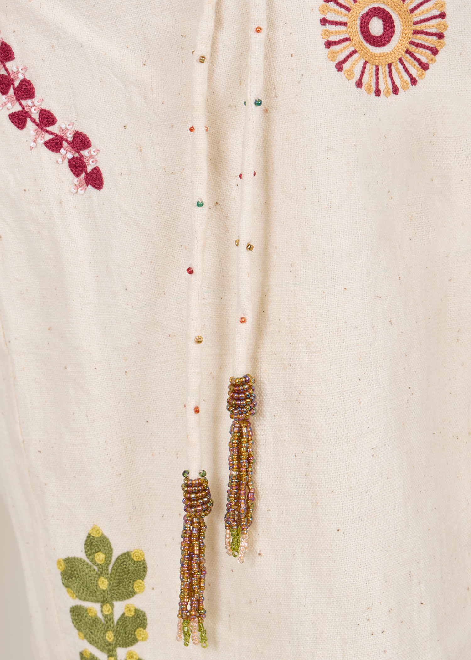 This garment was woven by hand using Kala cotton and hand-embroidered by female artisans. Kala cotton is one of the oldest types of cotton in the world and is special because it grows naturally with just rainwater, without the need for irrigation or chemicals, making it 100% organic and earth-friendly. Slight irregularities in the weave or color are a natural part of this process, evidence of the hands and land that shaped it.