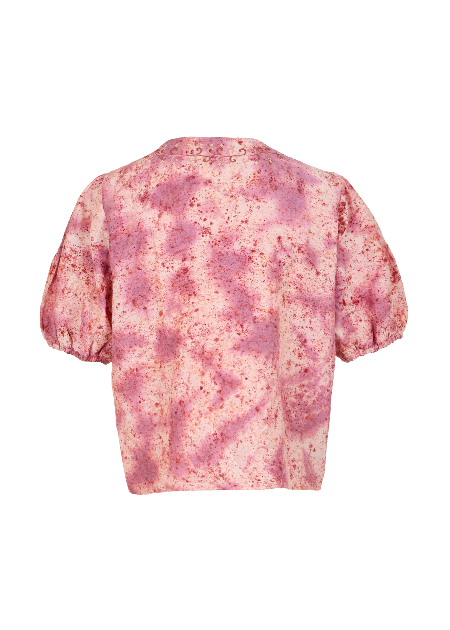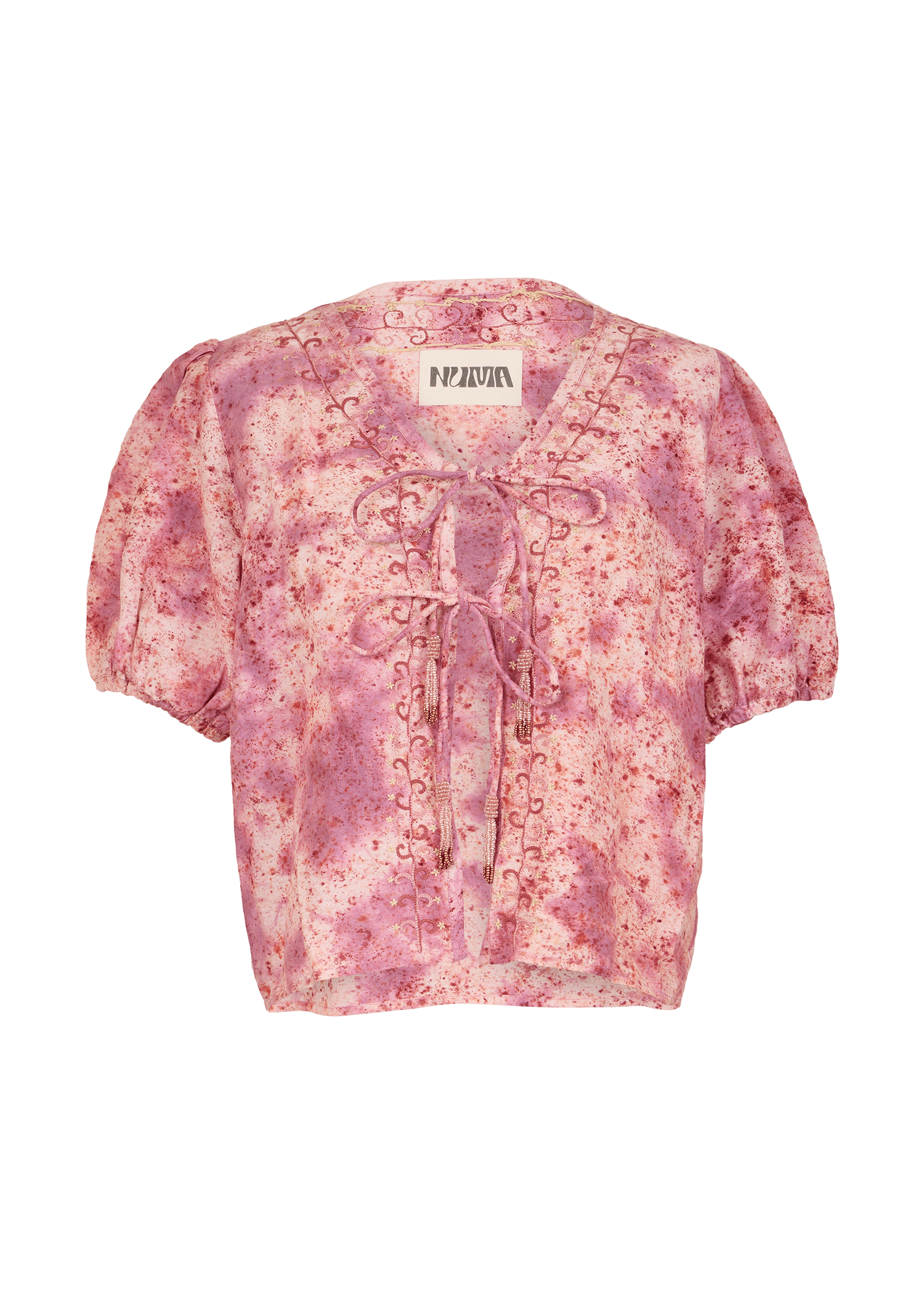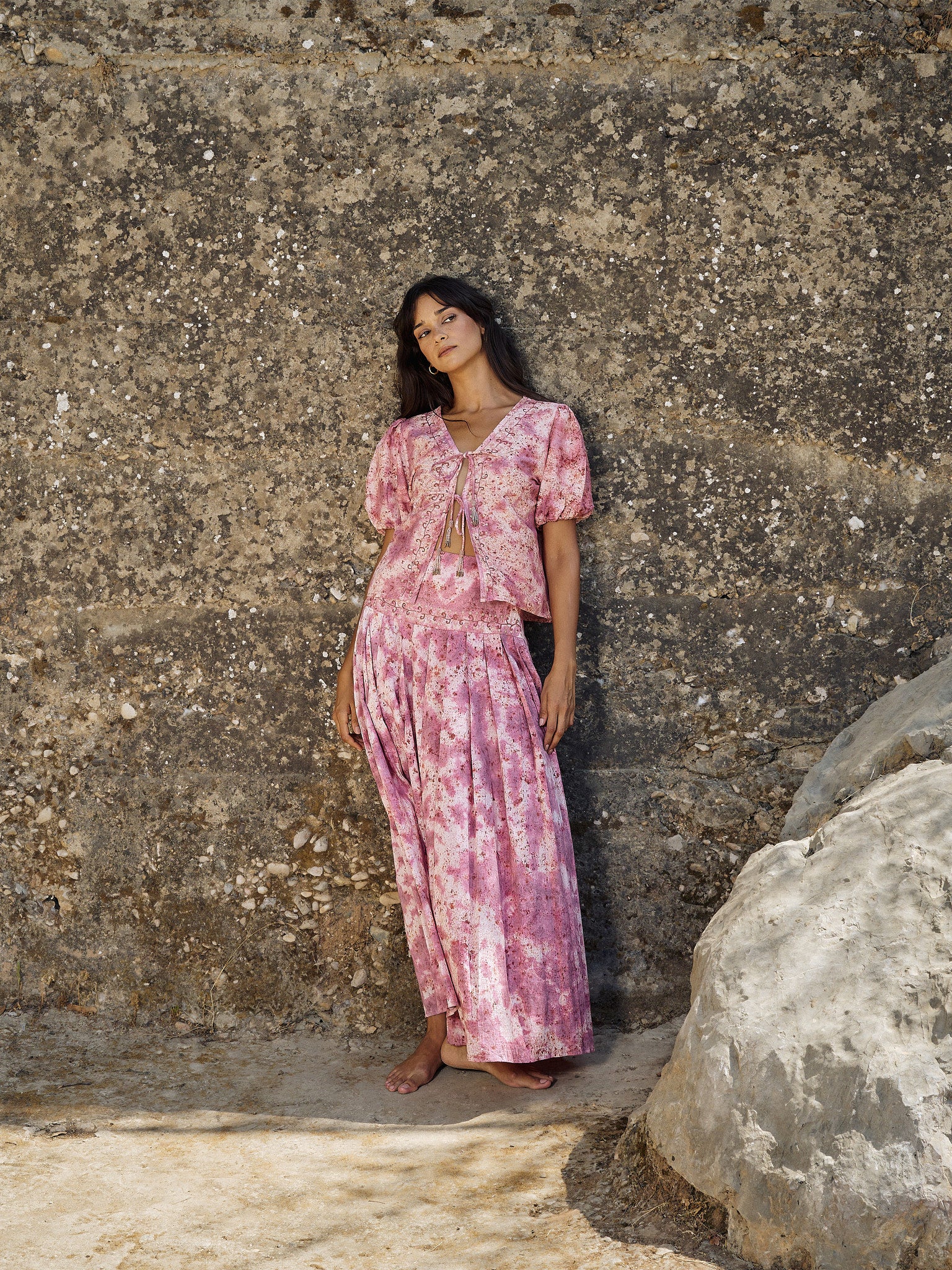 Naturally dyed with rose petals and crafted in a soft cotton-silk blend, this short sleeve V-neck top with tie ups features delicate hand embroidery and is finished with our signature tassels. It is best paired with the matching skirt.