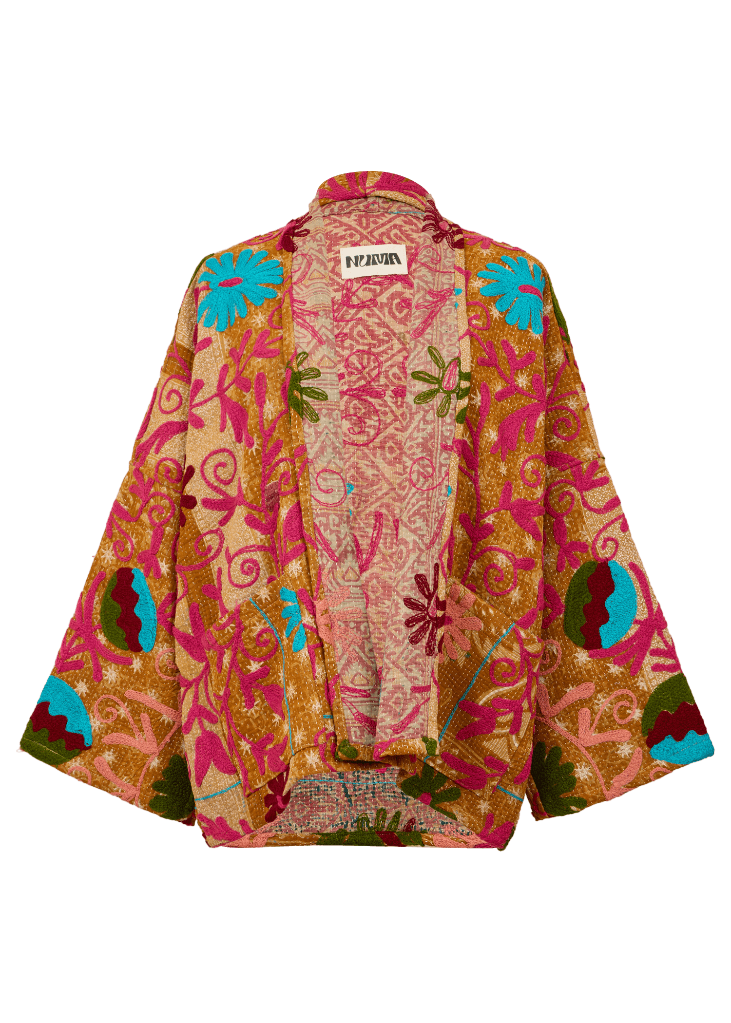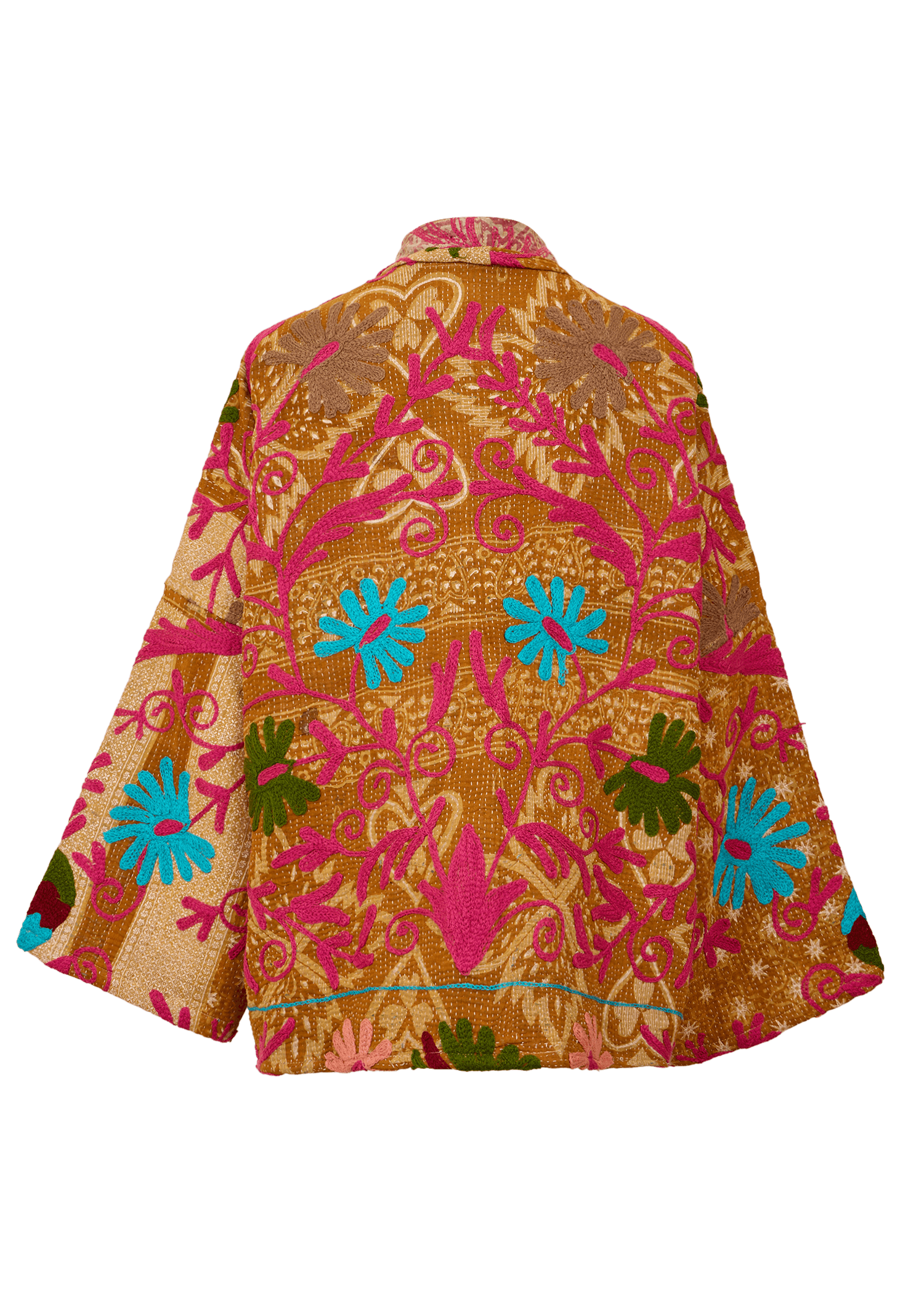 The short-length jacket has a loose fit with drop shoulders, 3/4 sleeves and pockets at the front. It's made of a unique vintage Kantha quilt adorned with Suzani embroidery.