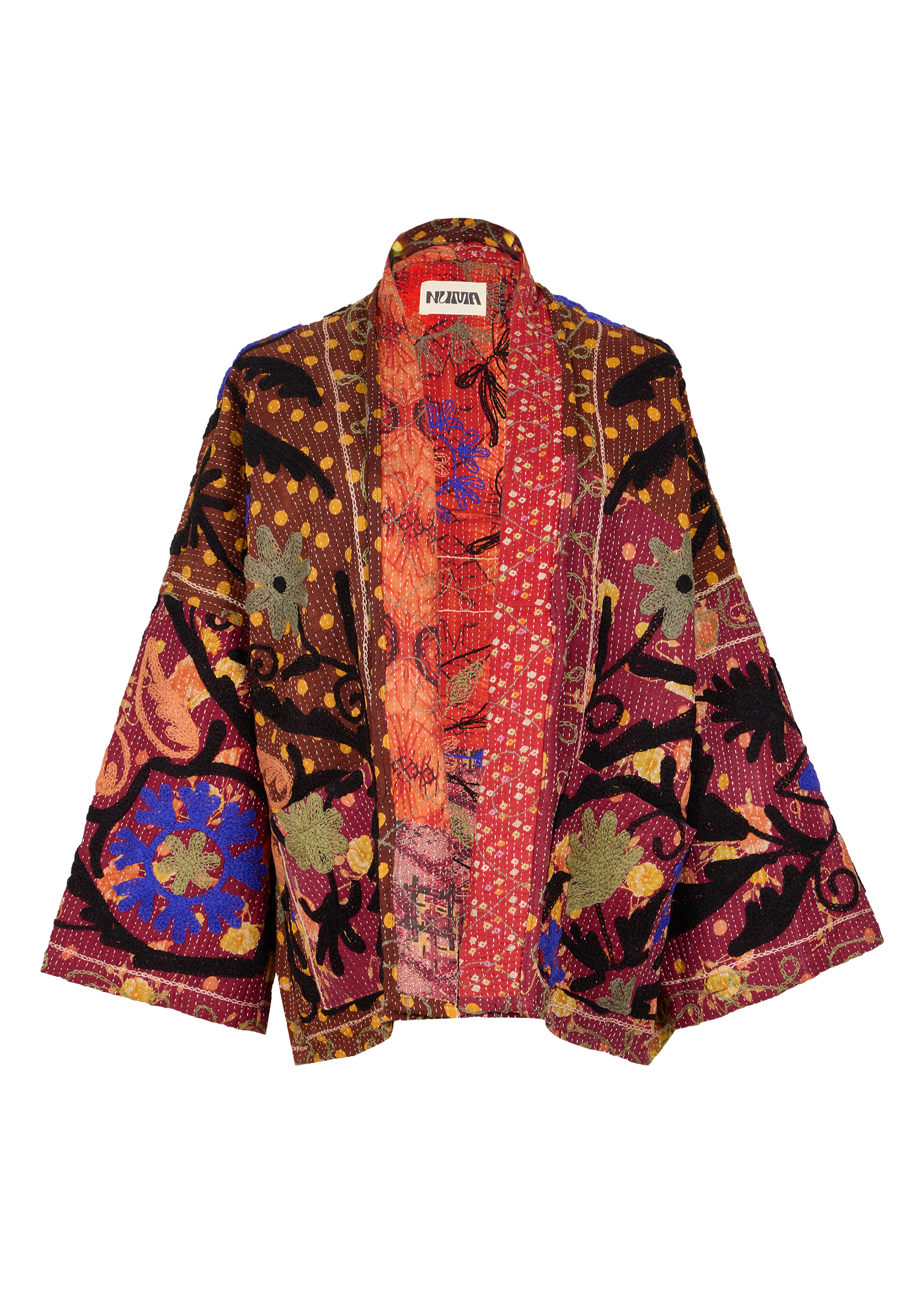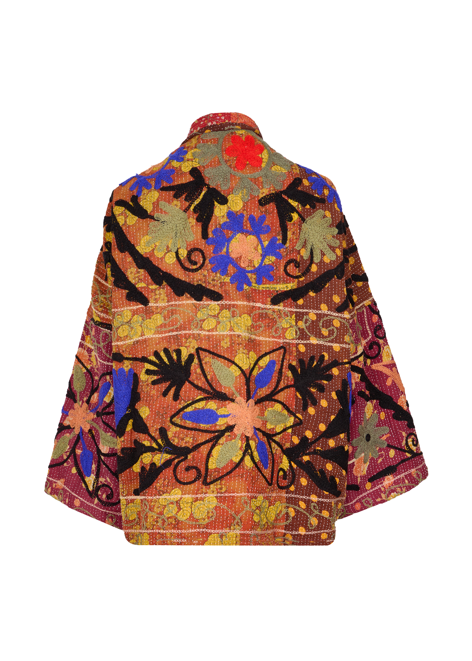 The short-length jacket has a loose fit with drop shoulders, 3/4 sleeves and pockets at the front. It's made of a unique vintage Kantha quilt adorned with Suzani embroidery.