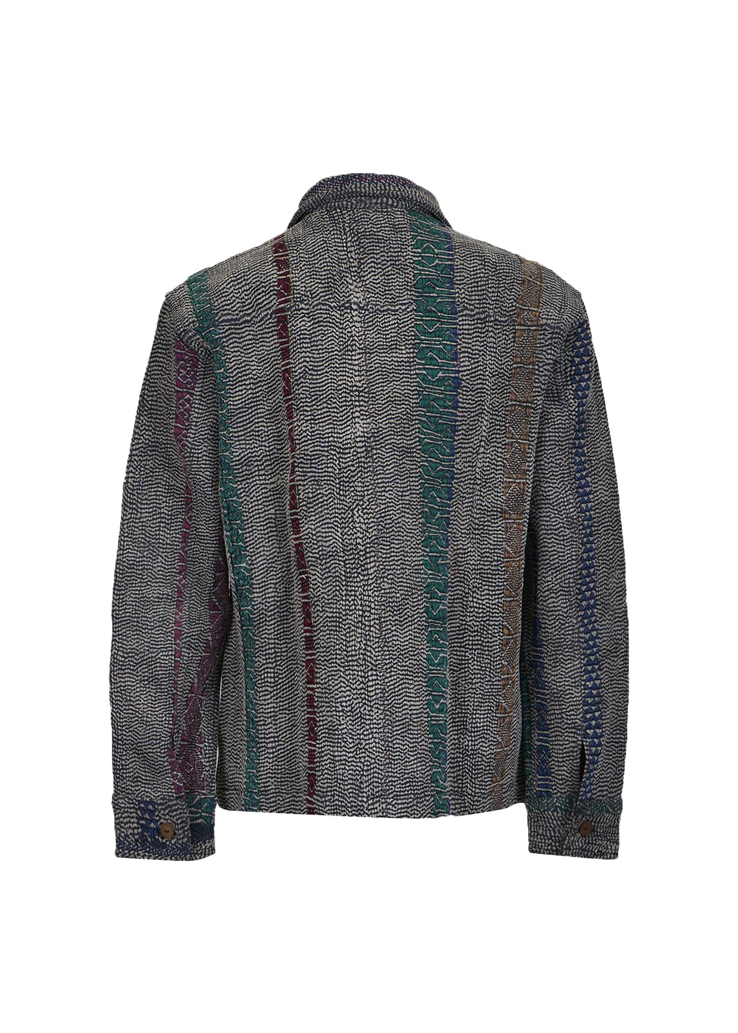 This Men's jacket is crafted from vintage Kantha fabric, featuring a unique stone-washed finish for a soft, worn-in texture. It includes a classic collar, a full front zip closure, with two patch pockets as well as side hidden pockets for ultimate functionality.