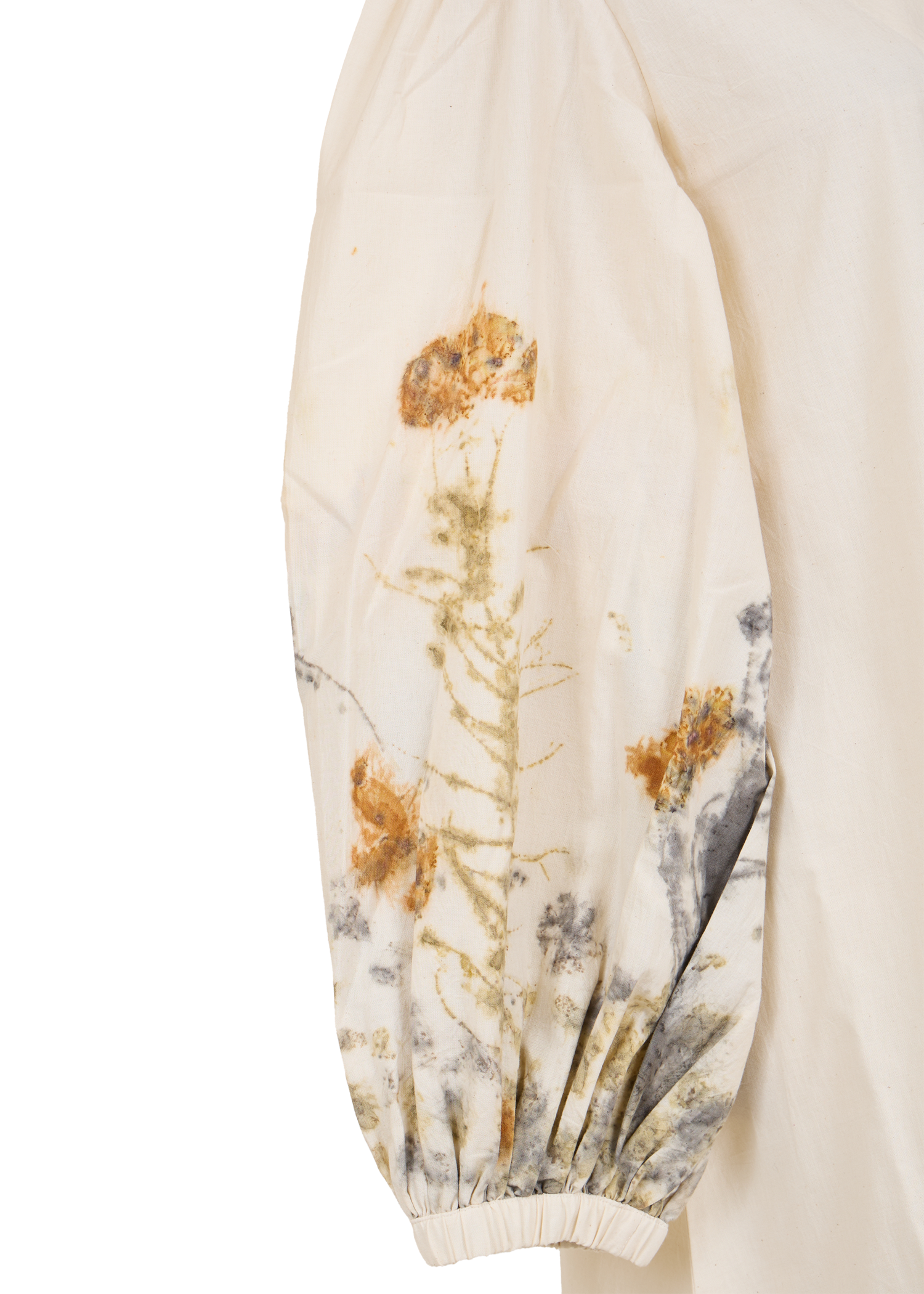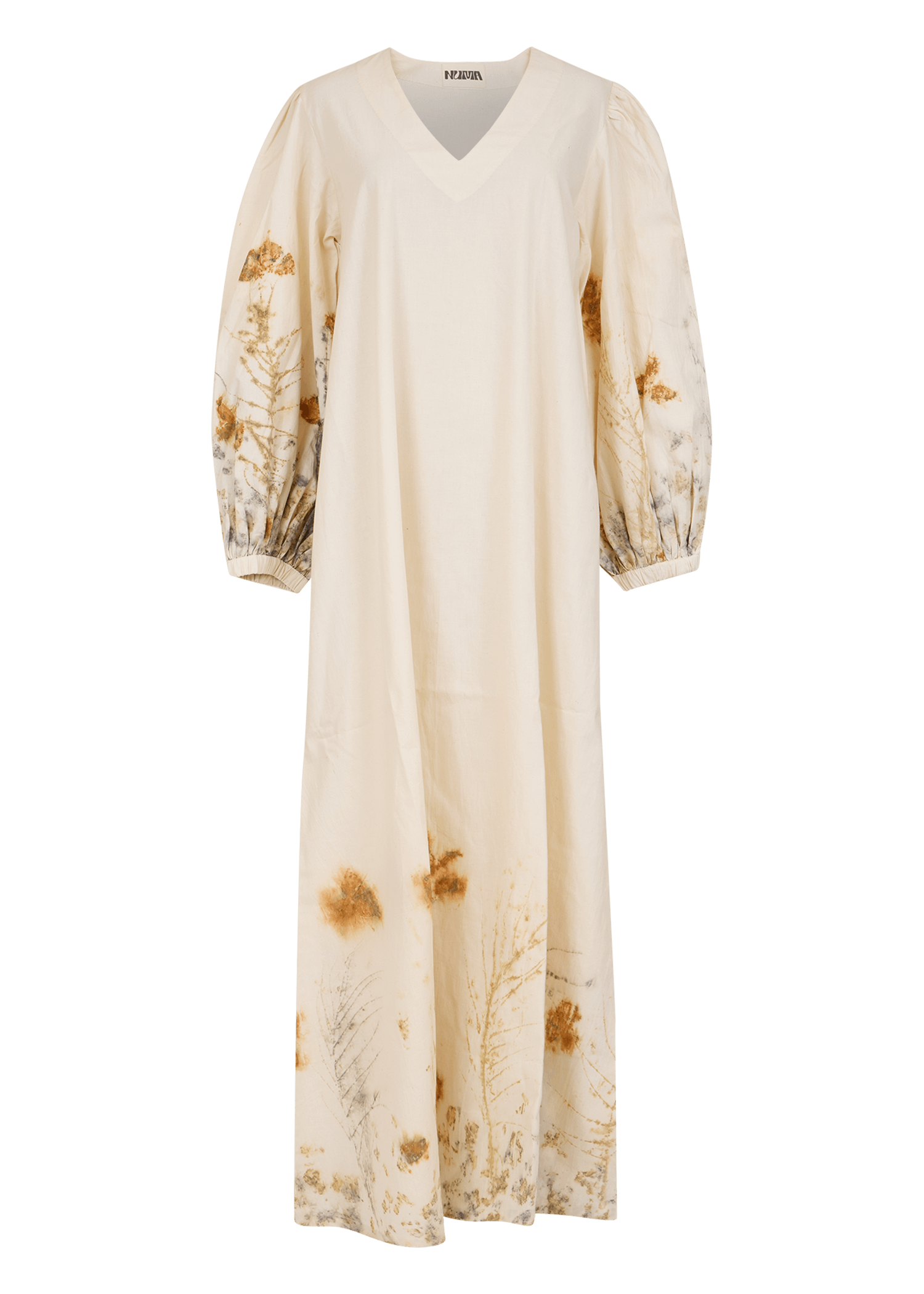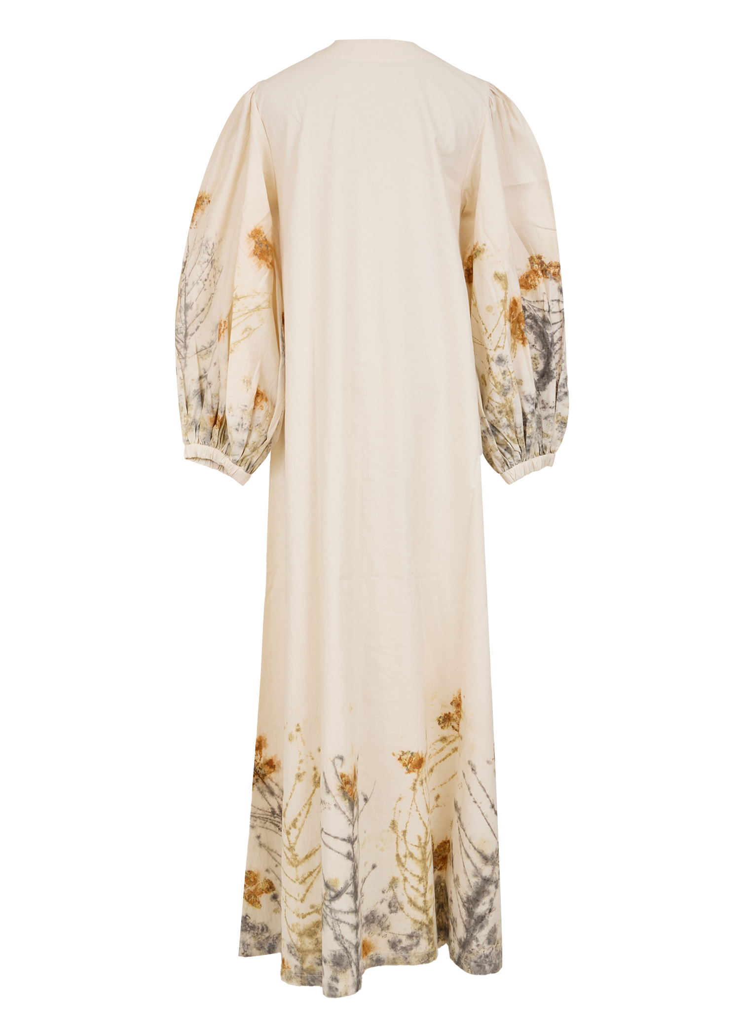 Naturally dyed and printed with marigold flowers and local leaves, this V-neck maxi dress is crafted in breathable Khadi cotton. Featuring balloon sleeves and a relaxed silhouette, it’s an effortless statement piece for everyday wear.
