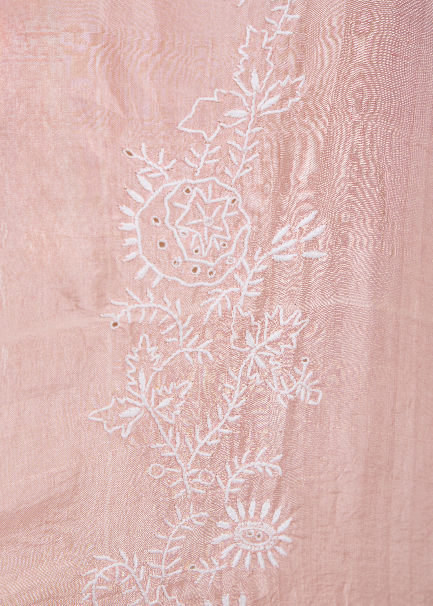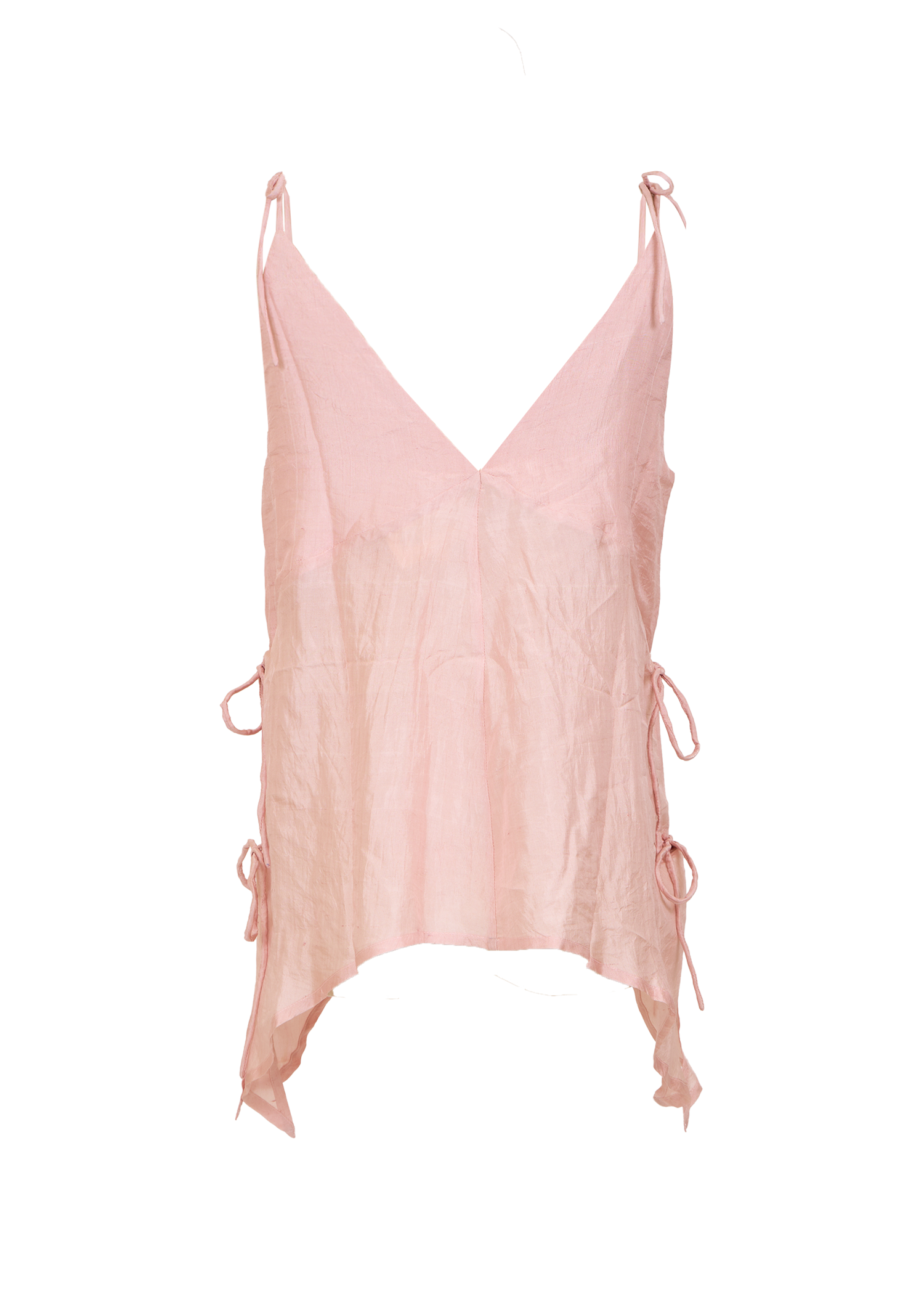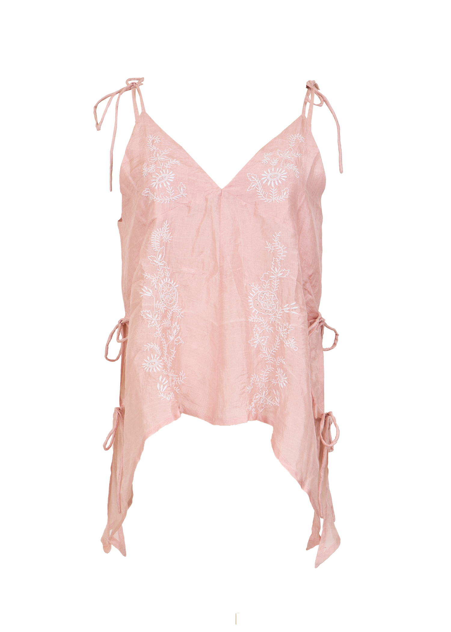 Delicately crafted from mulberry silk, this soft blush top features intricate hand-done Chikankari embroidery from Lucknow. The adjustable tie details on the shoulders and sides give this top a relaxed, feminine silhouette.