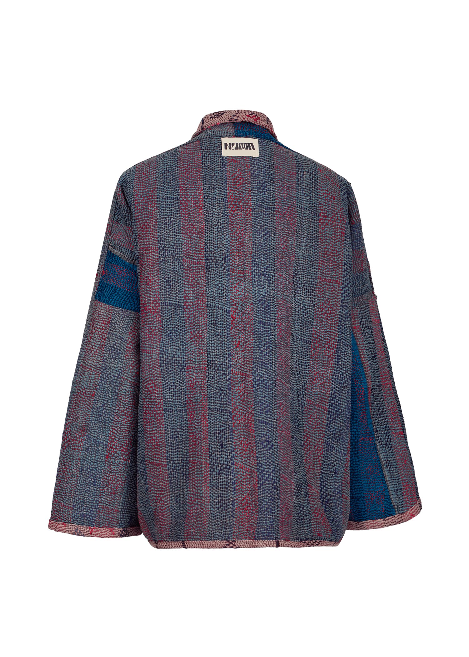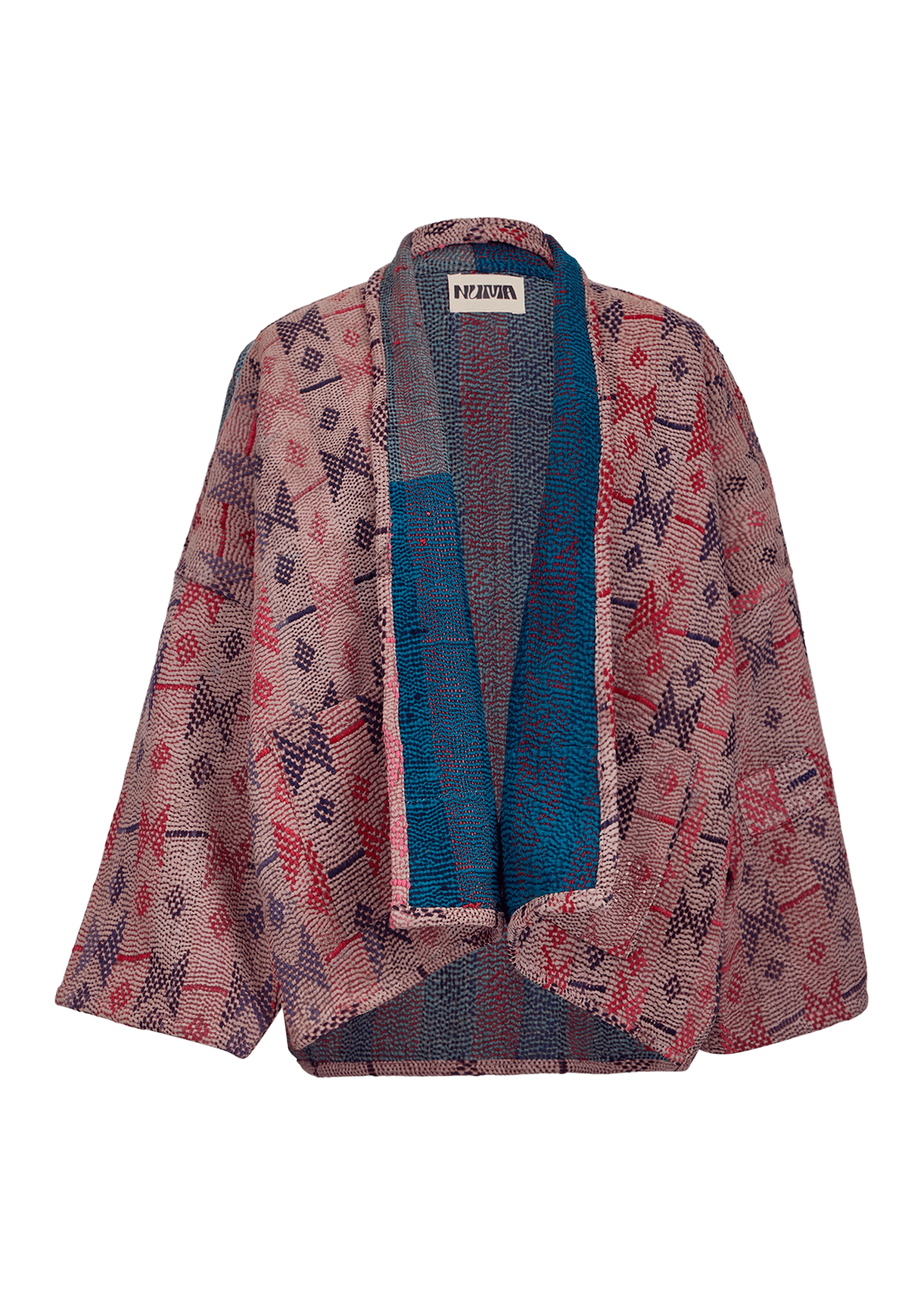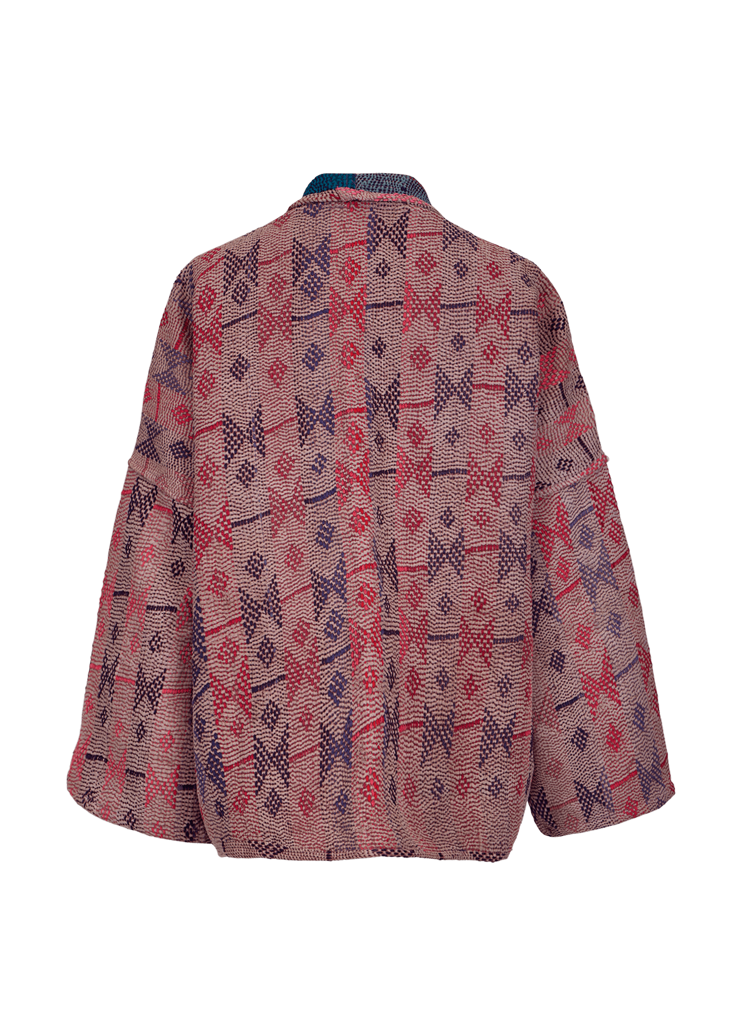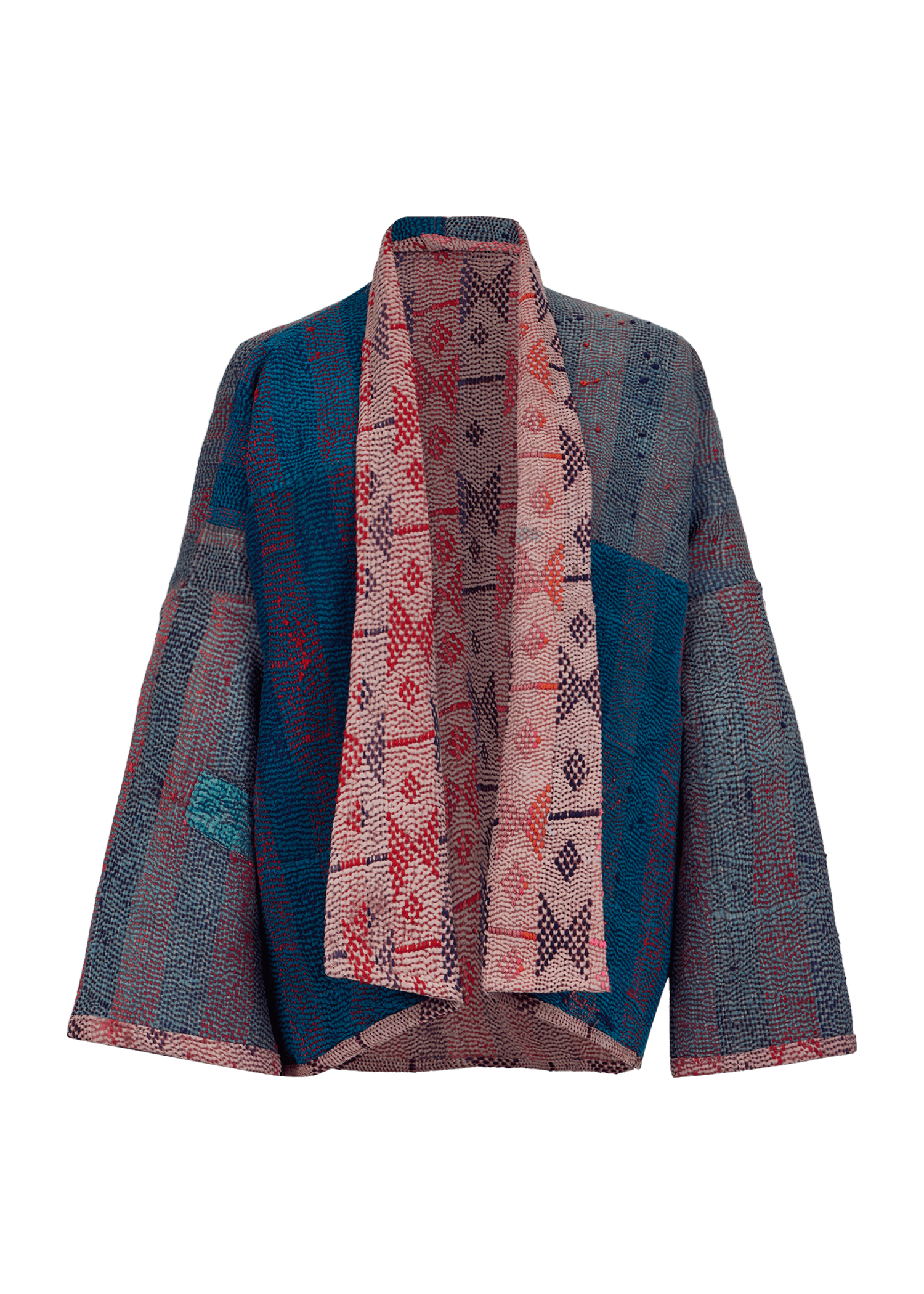 The reversible short-length jacket has a loose fit with drop shoulders, 3/4 sleeves and pockets at the front. It is crafted from vintage Kantha fabric, featuring a unique stone-washed finish for a soft, worn-in texture.