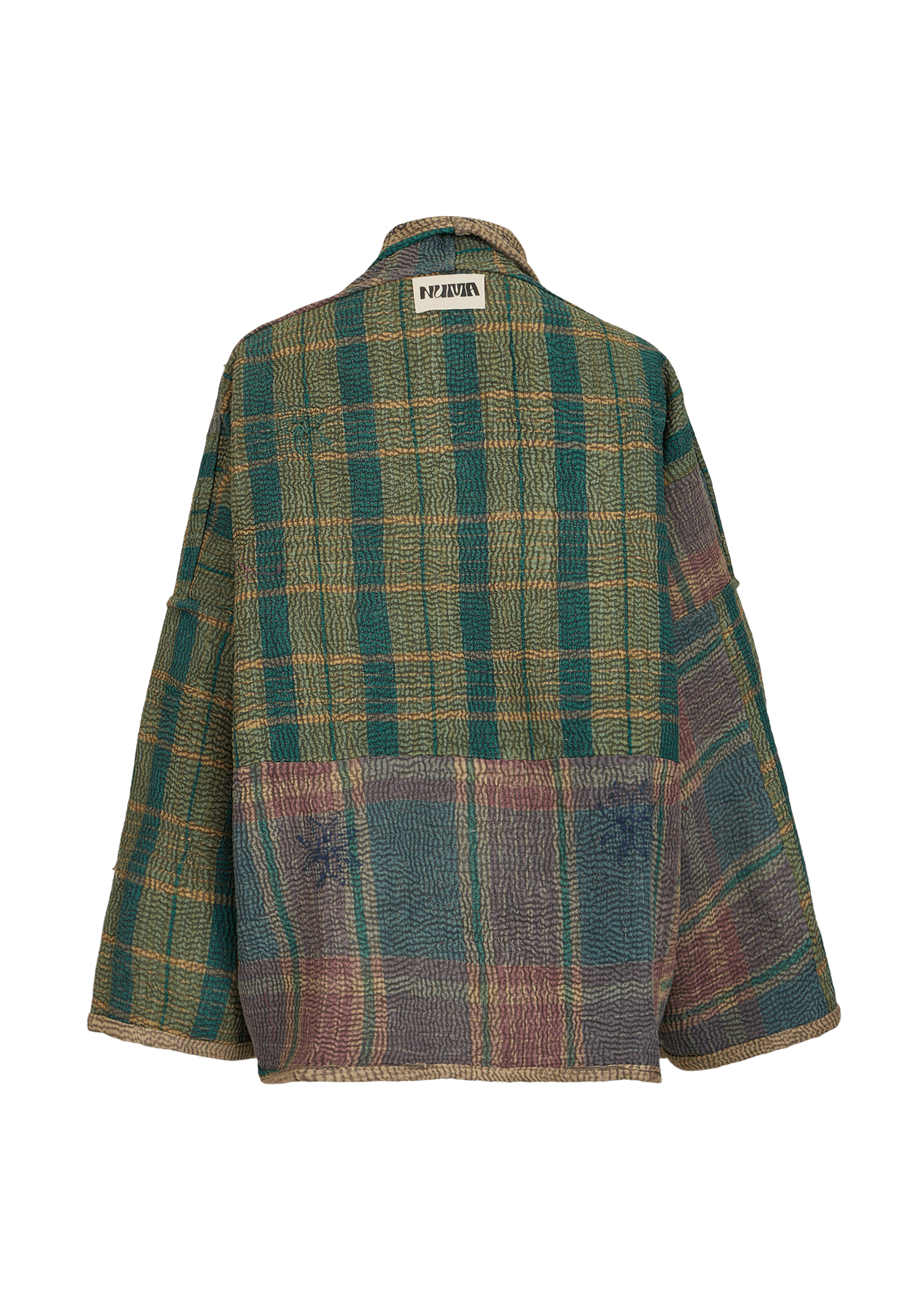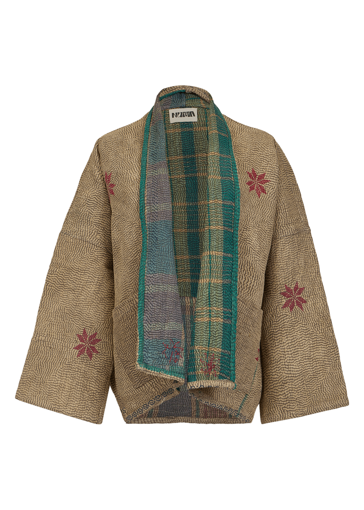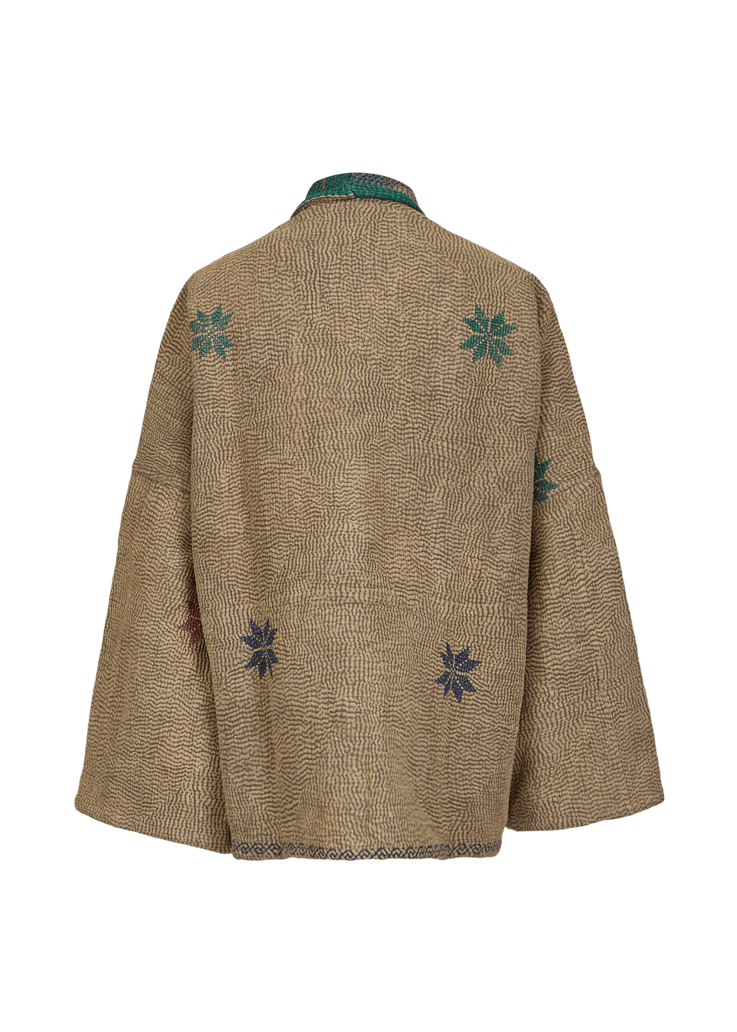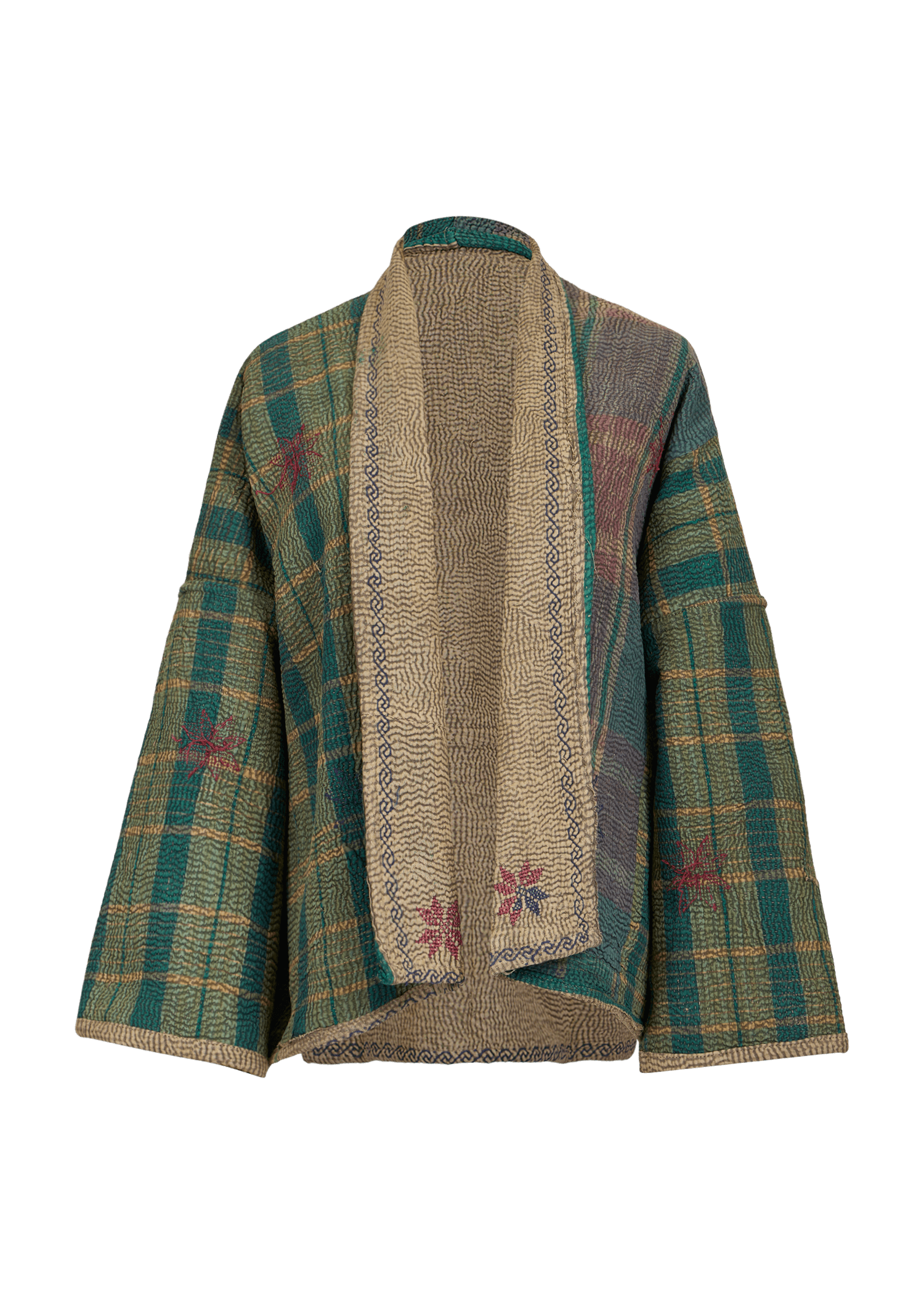 The reversible short-length jacket has a loose fit with drop shoulders, 3/4 sleeves and pockets at the front. It is crafted from vintage Kantha fabric, featuring a unique stone-washed finish for a soft, worn-in texture.