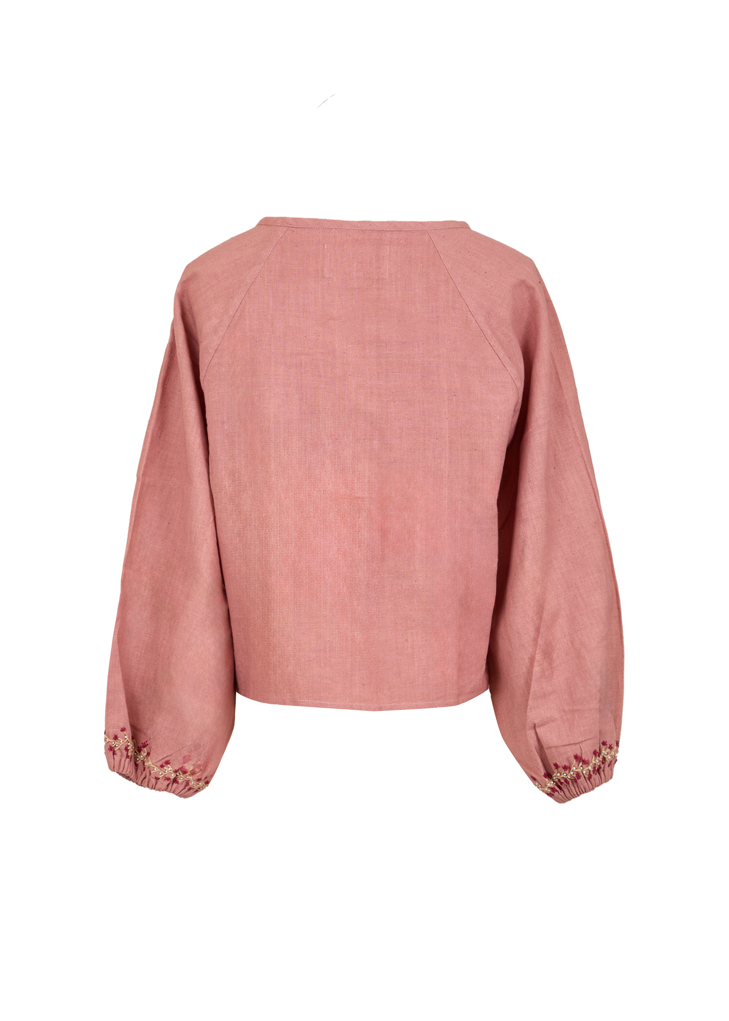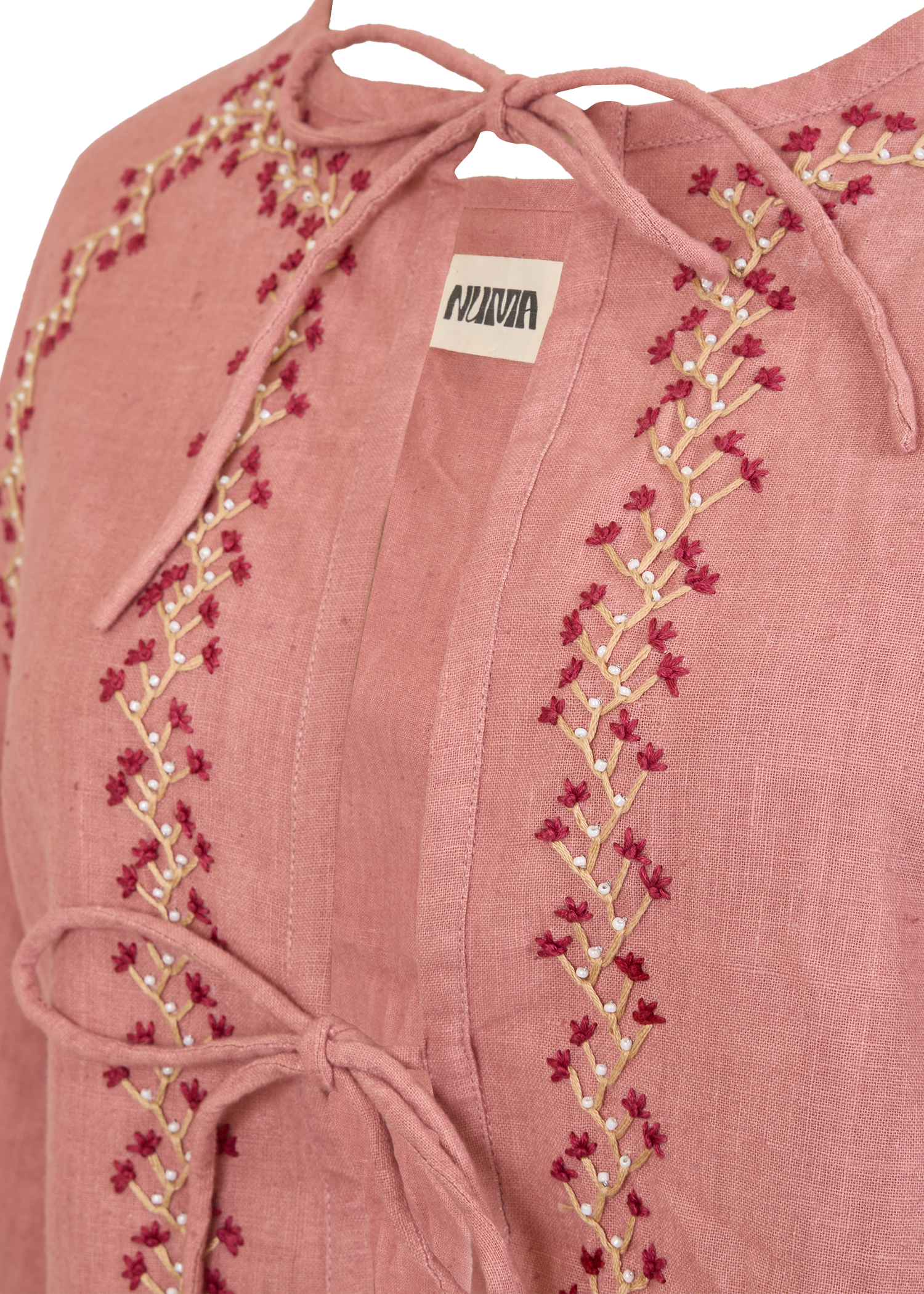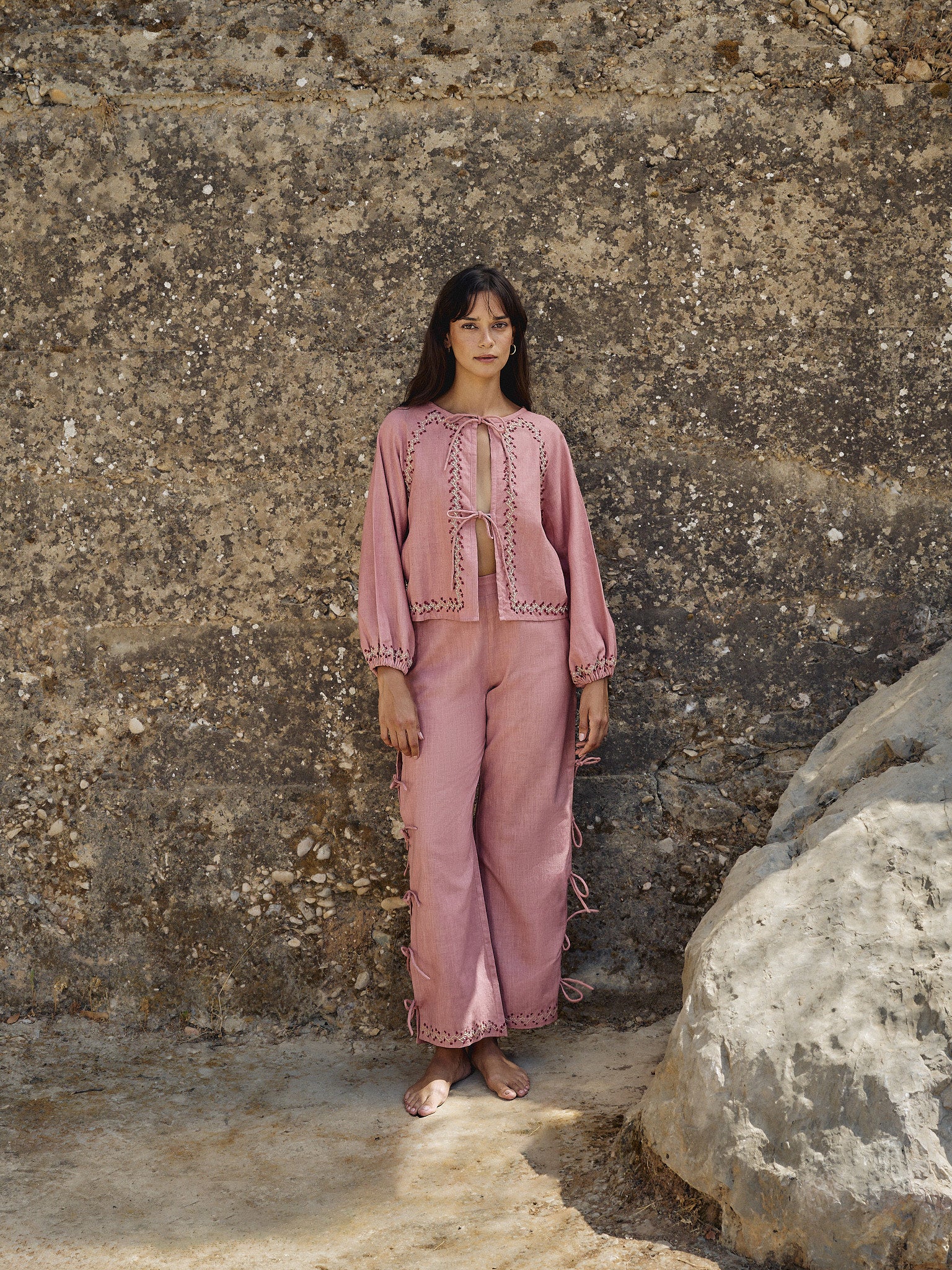 This long-sleeve tie-up Khadi cotton top is dyed with azo-free colors and features intricate needlework. Relaxed yet refined, it’s an artisanal piece designed for versatile everyday wear. It is best paired with the matching pants.