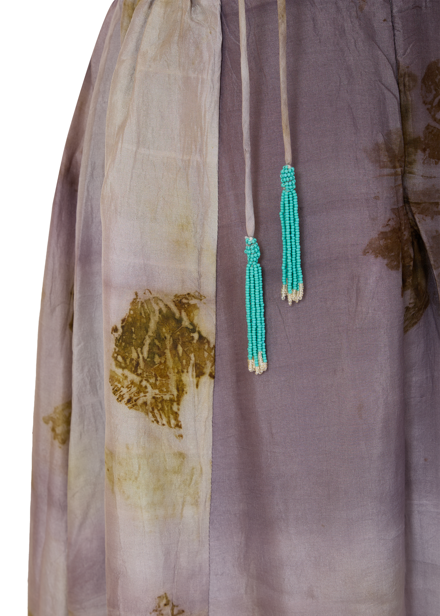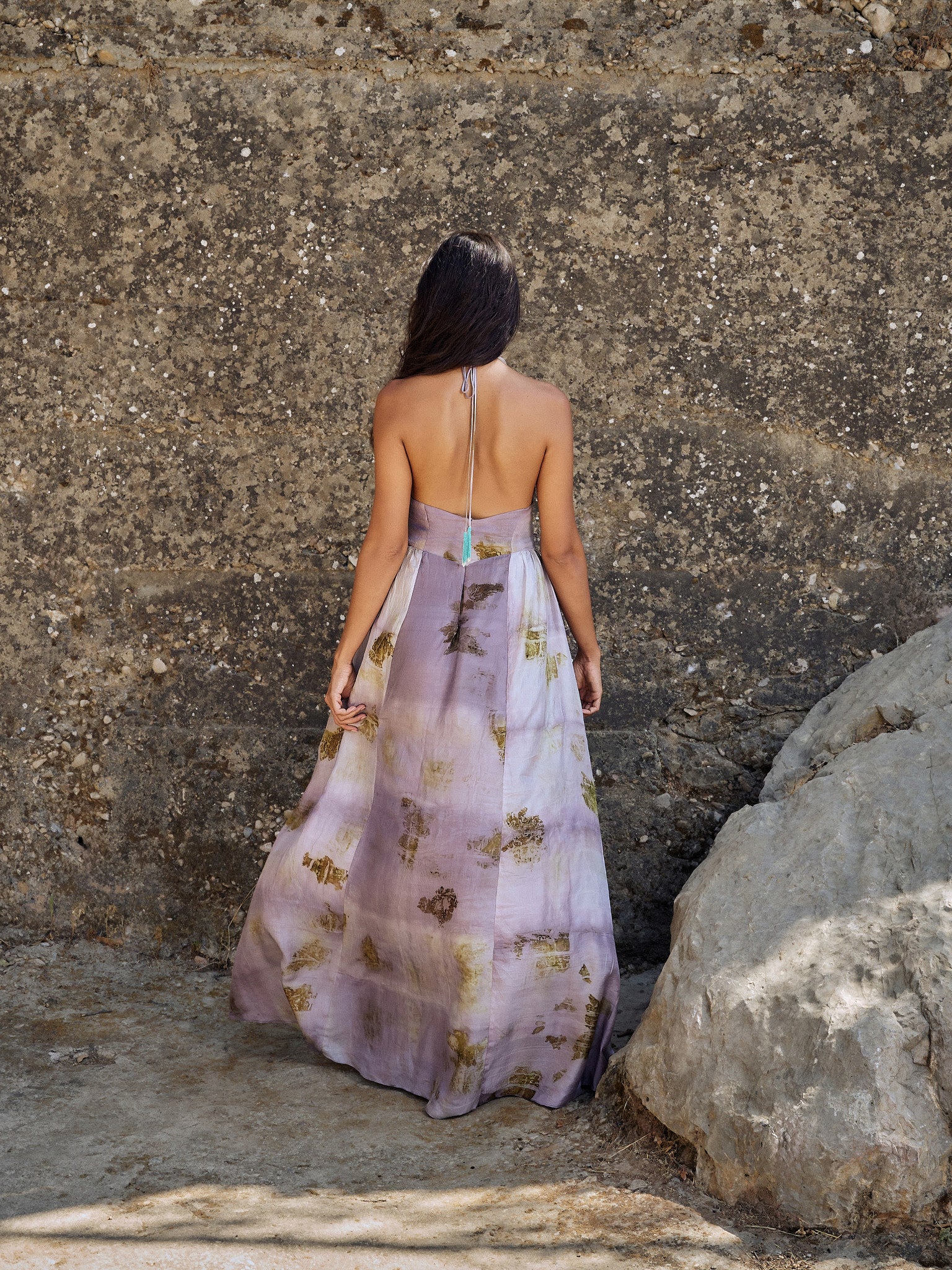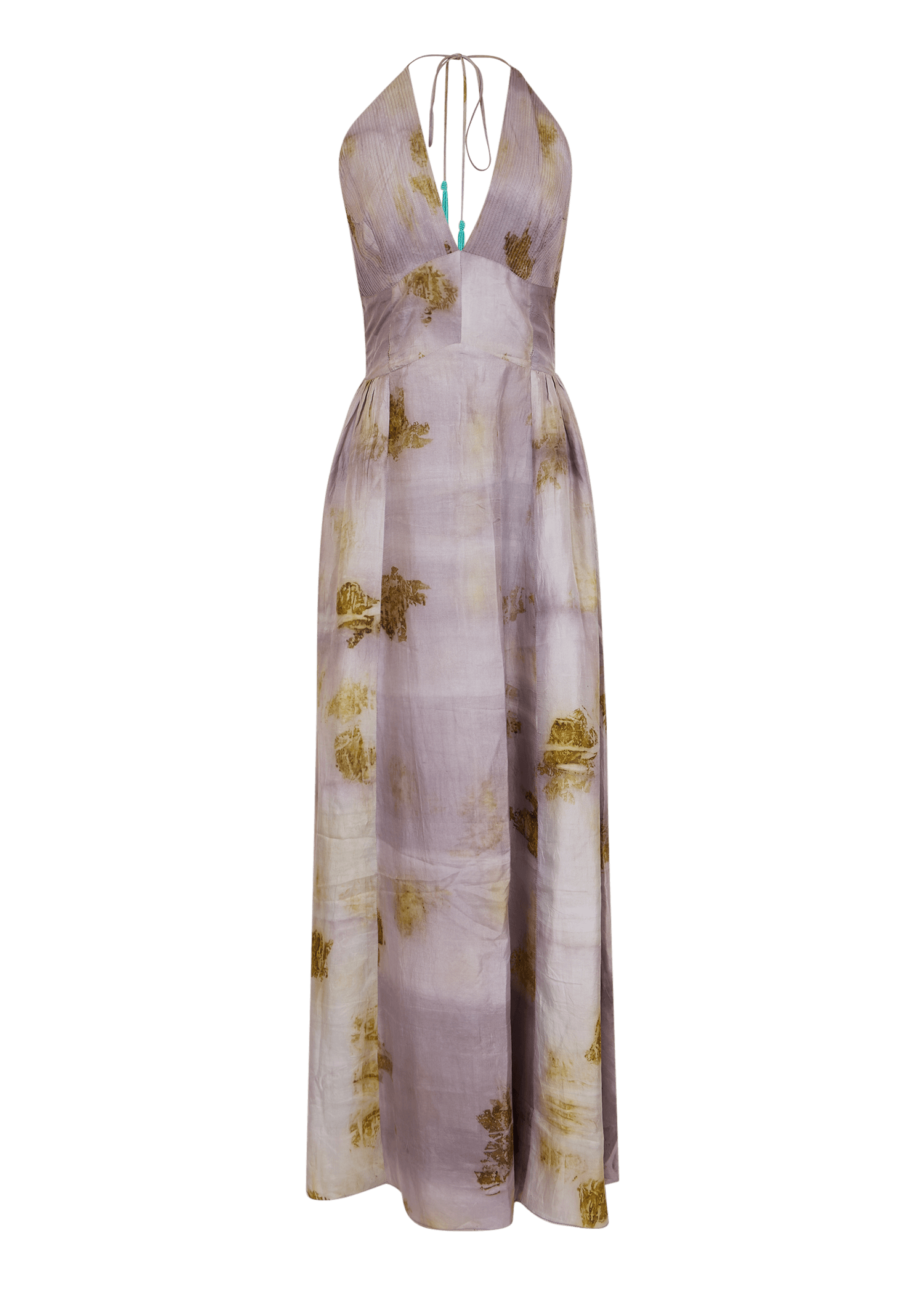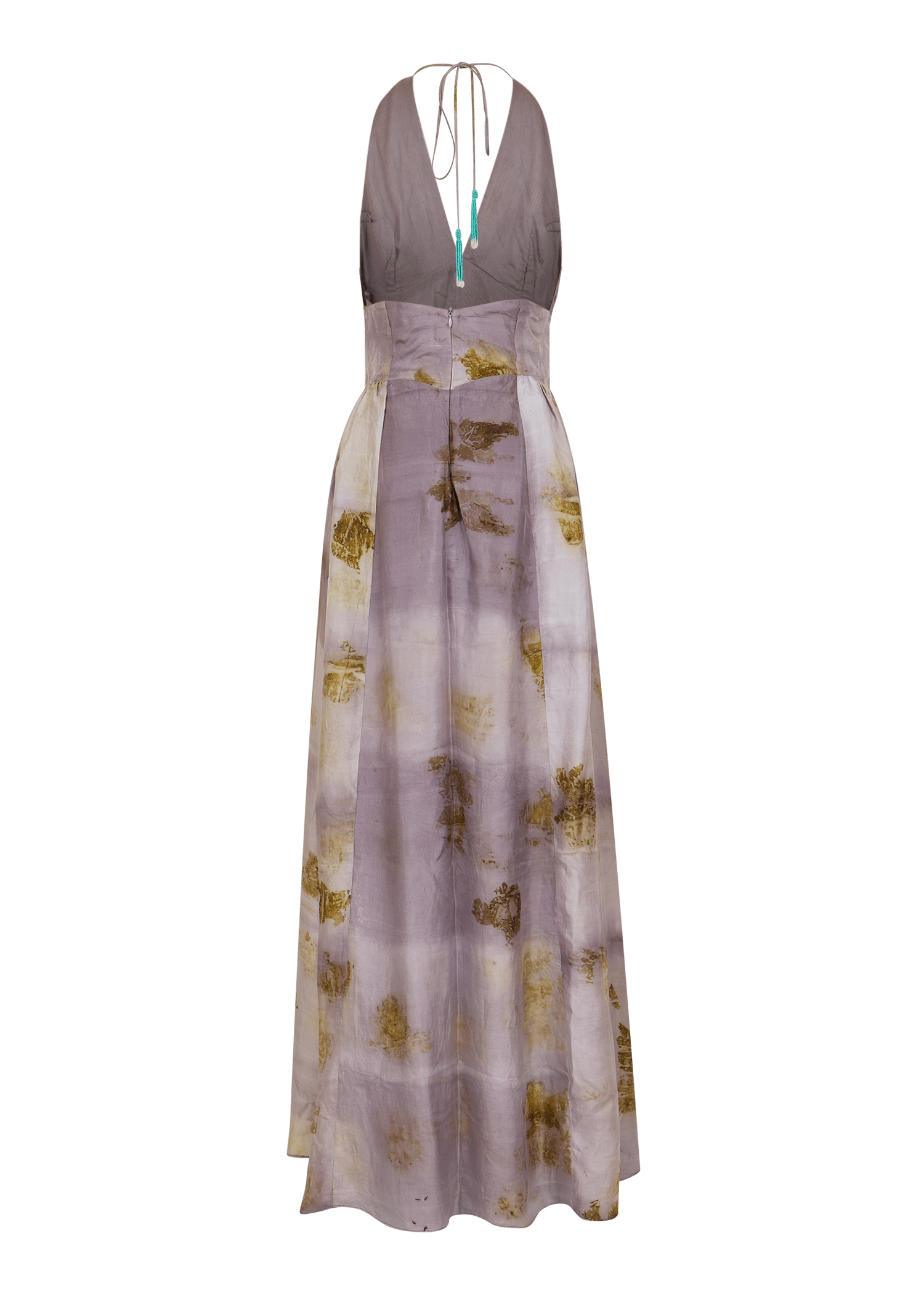 Naturally dyed with onion peel and sappanwood, this halter-neck maxi silk dress blends soft lilac tones with earthy accents and finished with our signature beaded tassel. Cut for a flowy and lightweight silhouette, perfect for day-to-night occasions.
