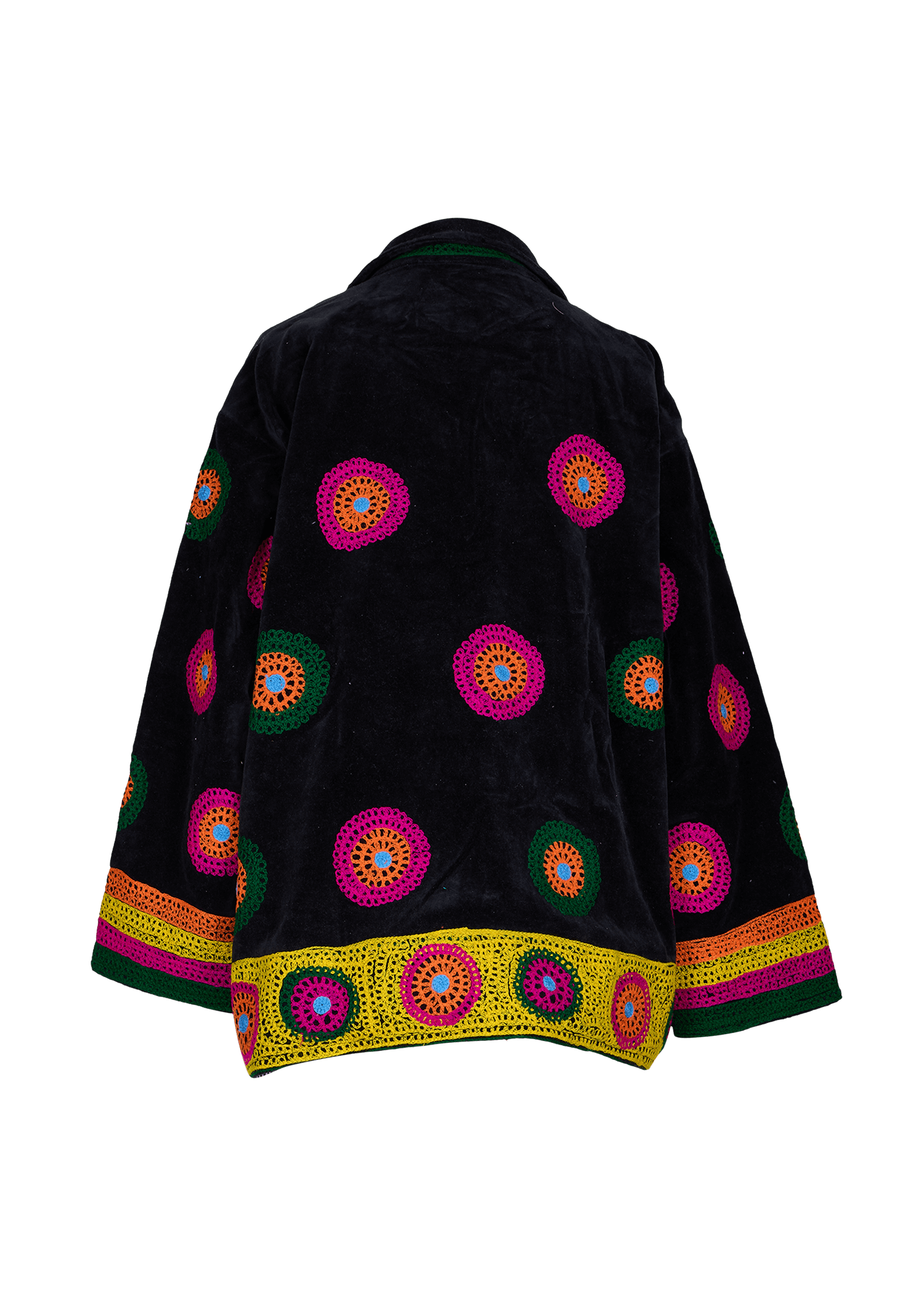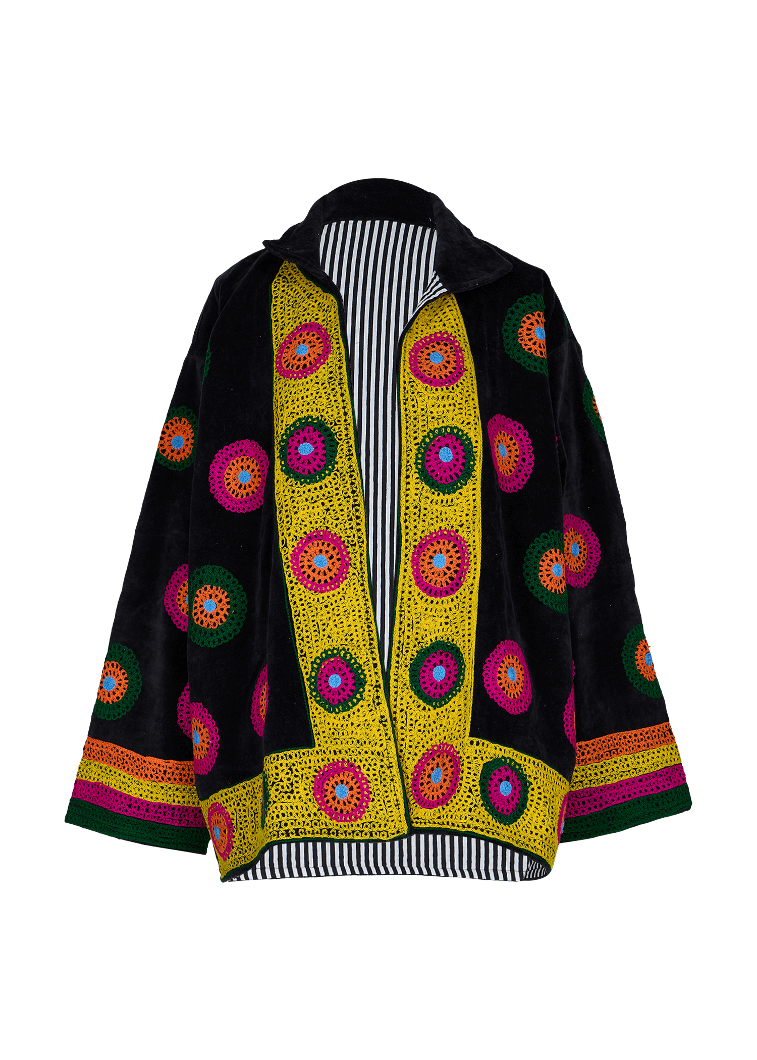 The regular length jacket has a high foldable collar and striped inner lining. The Suzani embroidery is done on a Velvet base, making it the perfect item to complete your transitional wardrobe!