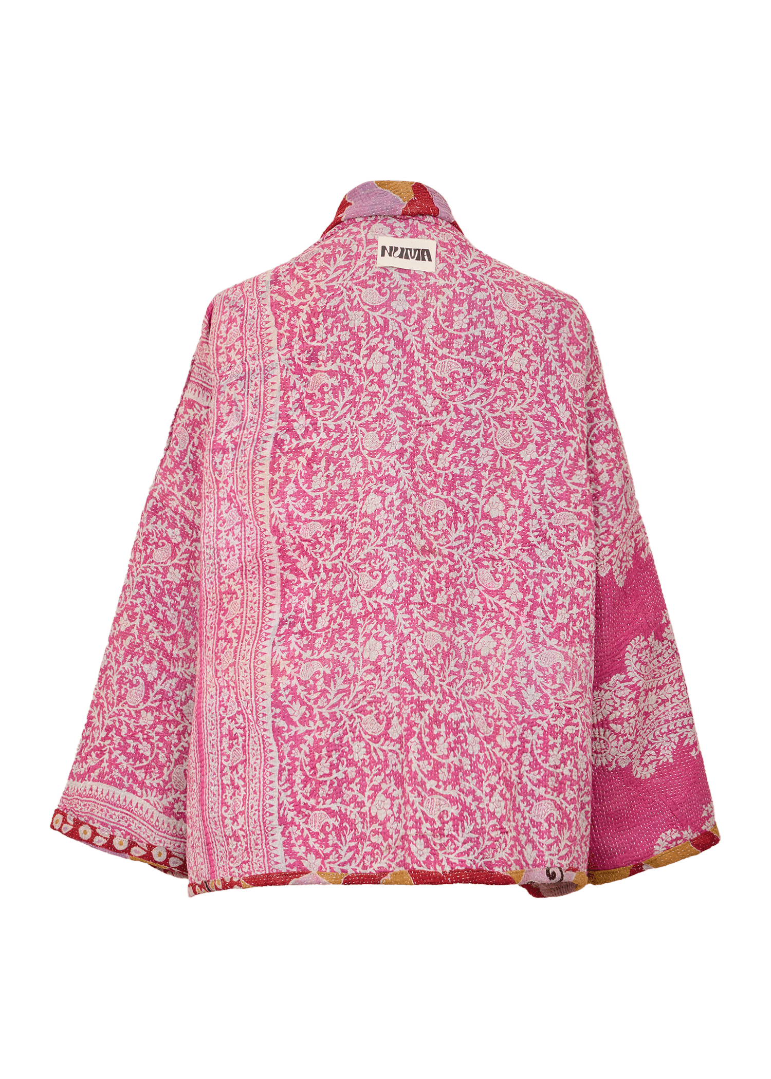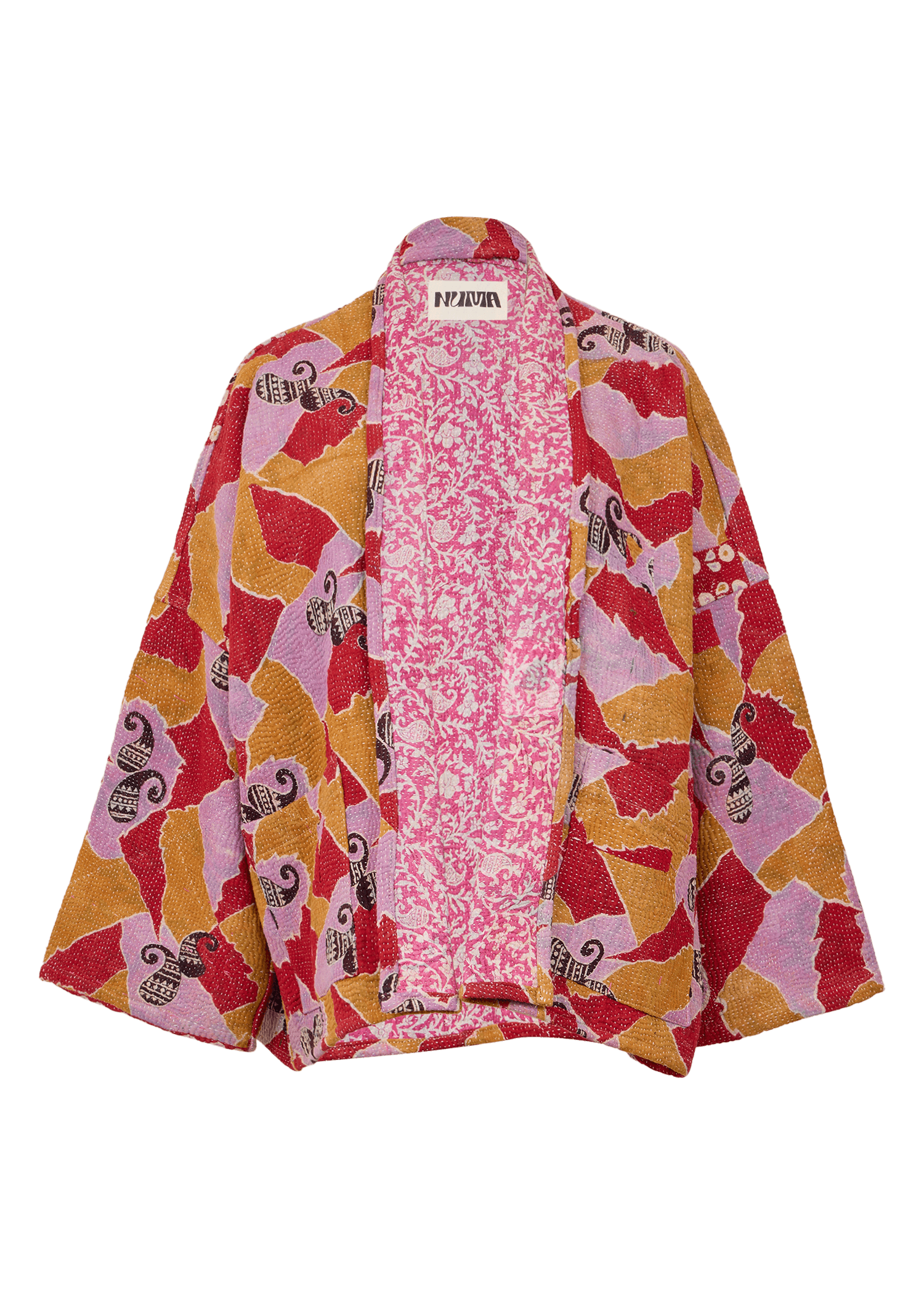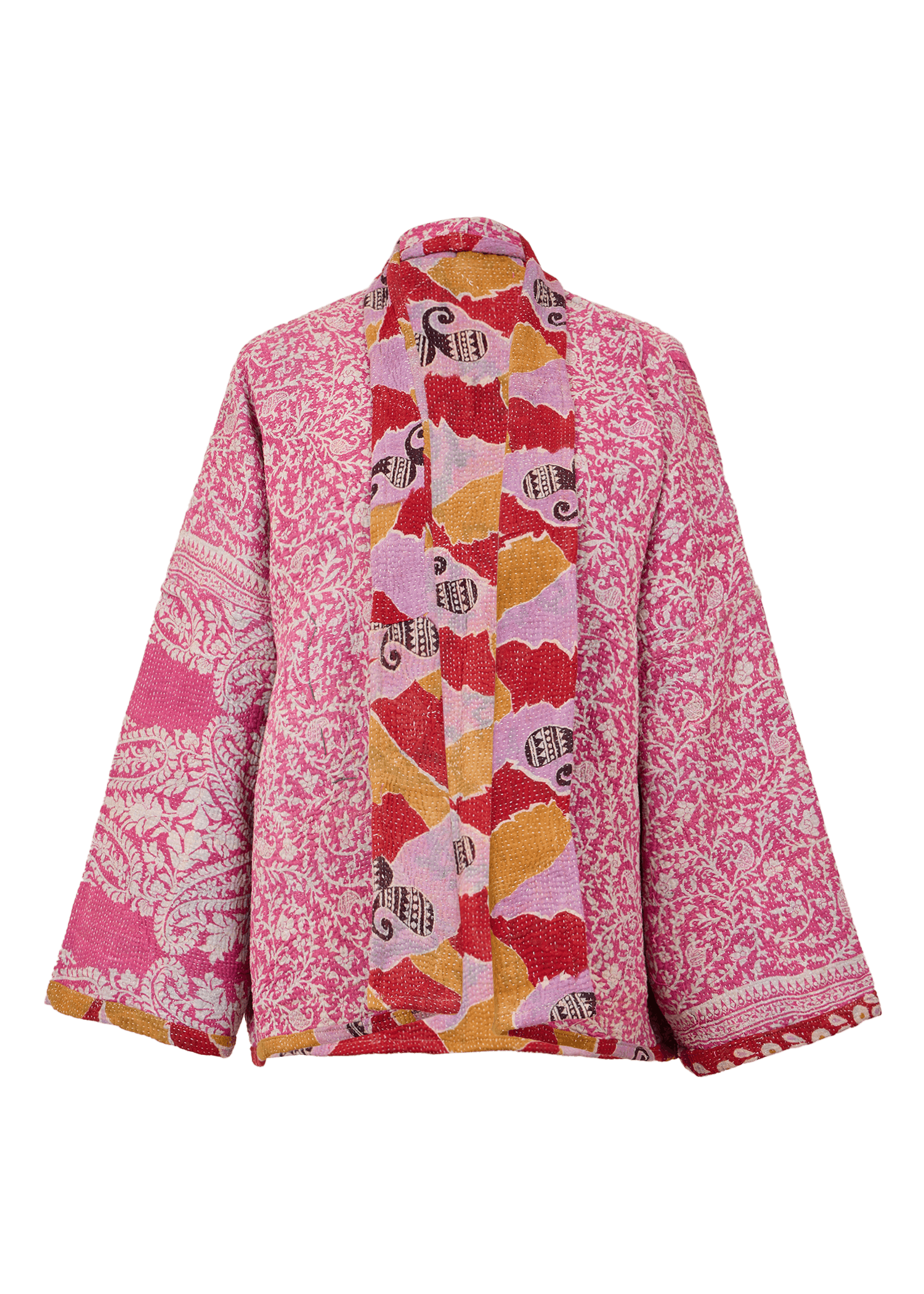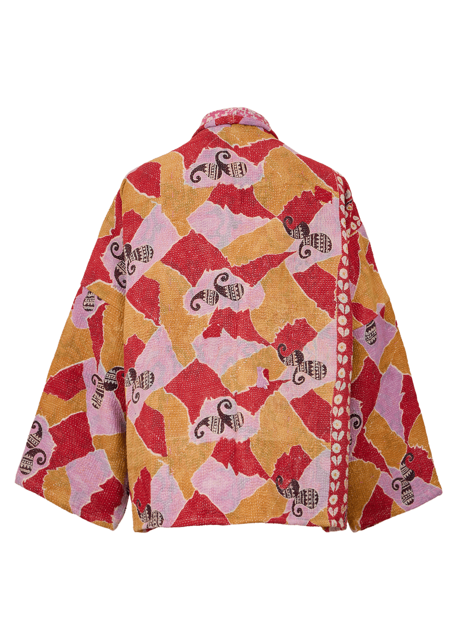 The reversible short-length jacket has a loose fit with drop shoulders, regular sleeves and pockets at the front. It's crafted from a unique vintage Kantha quilt made of layered printed saris.