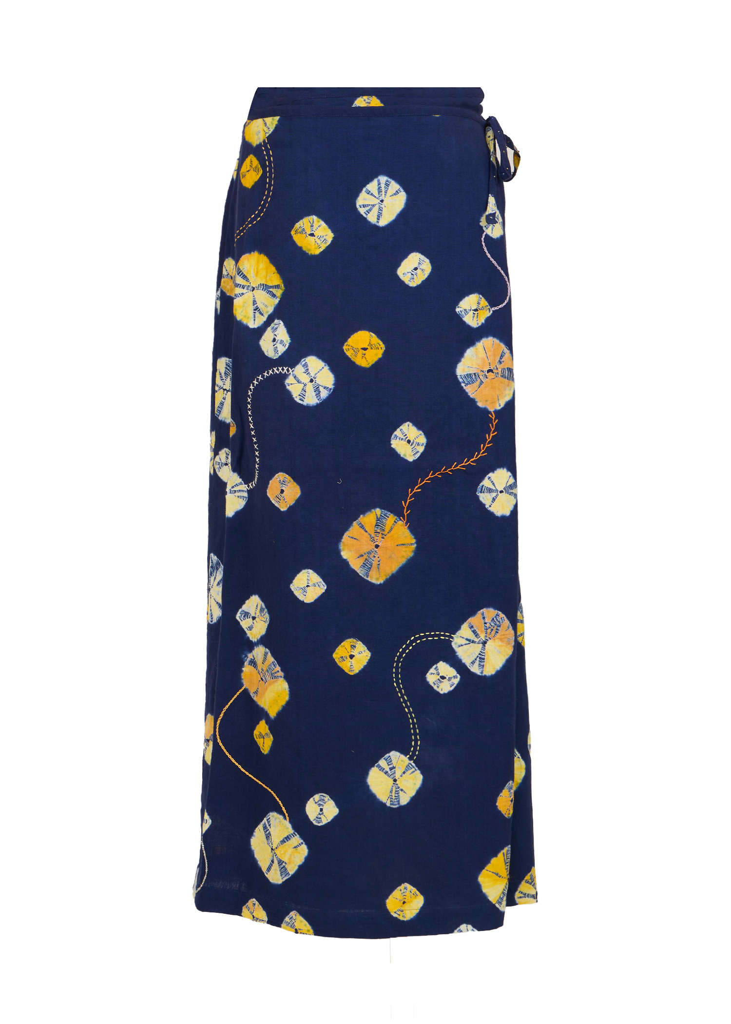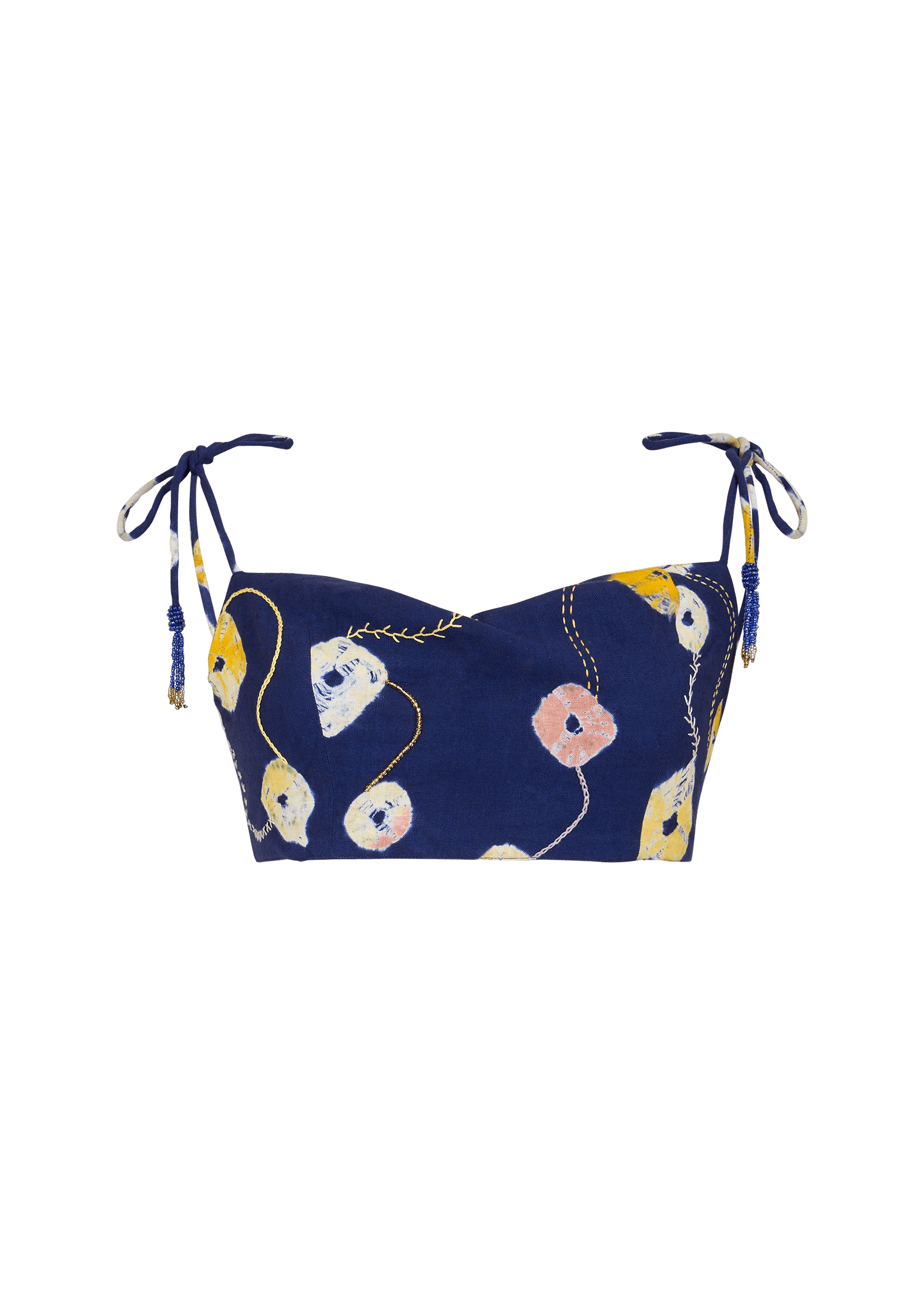 This Indigo two-piece set features traditional Bandhej tie-dye and delicate hand embroidery. The cropped top with tie straps pairs effortlessly with a wrap skirt creating a contemporary silhouette rooted in artisanal craft.